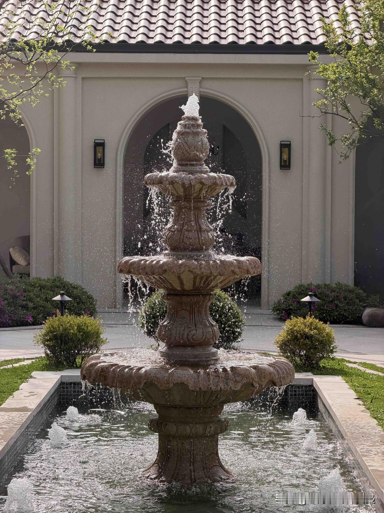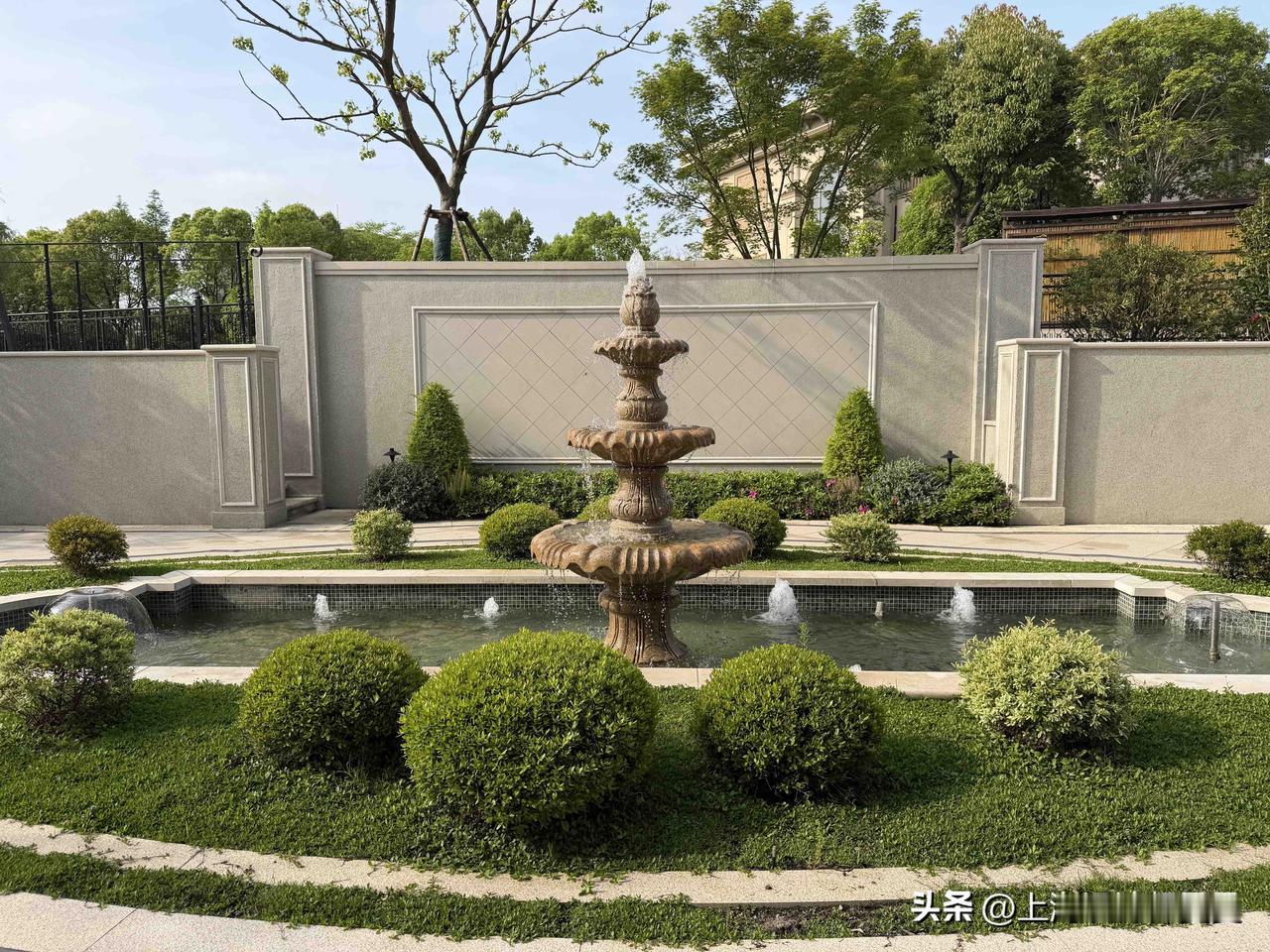 • 喷泉选了成品石雕款,比定制款省了一半费用;绿植用易养护的造型树+灌木,后期维护成本极低,不用频繁修剪打理