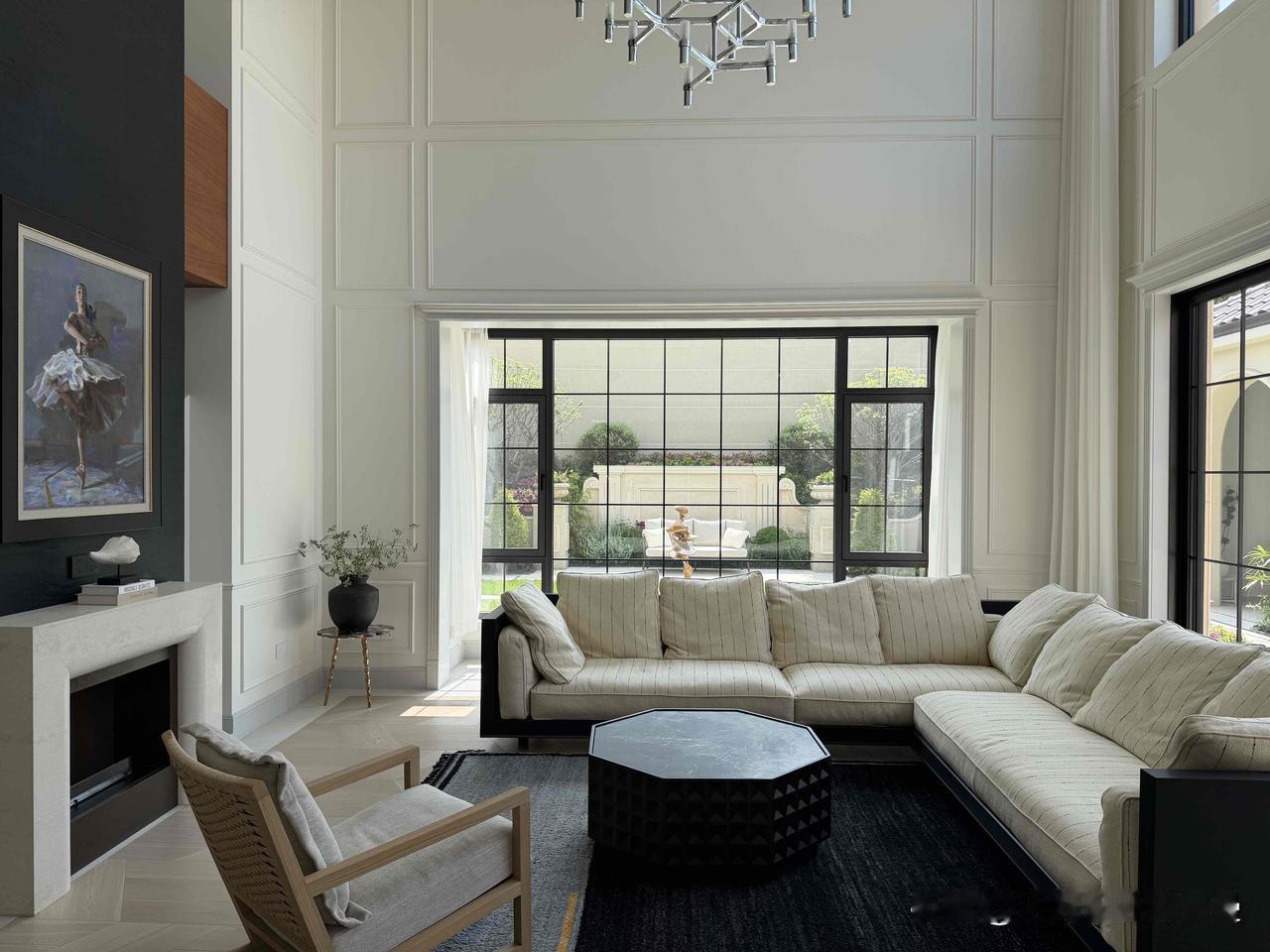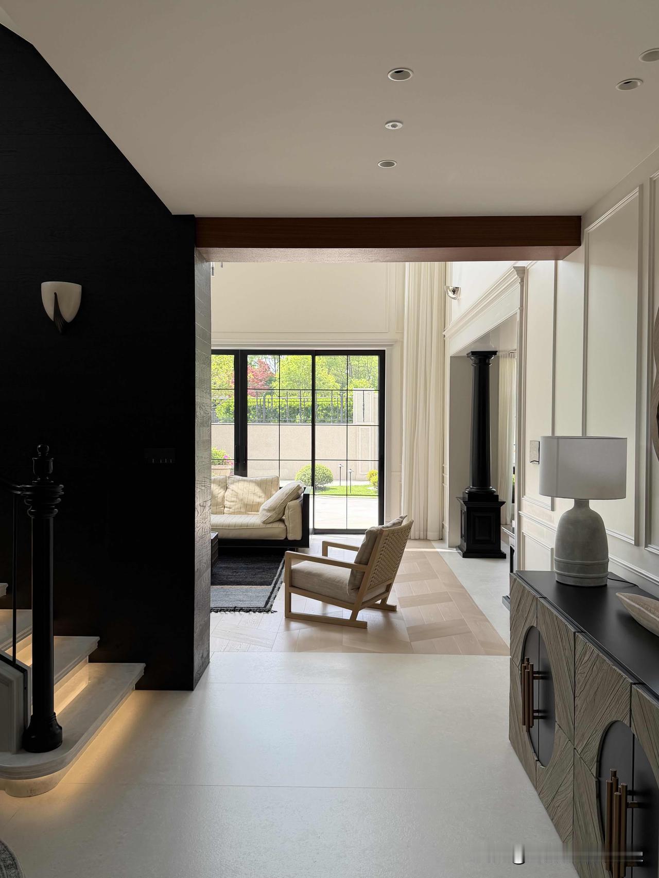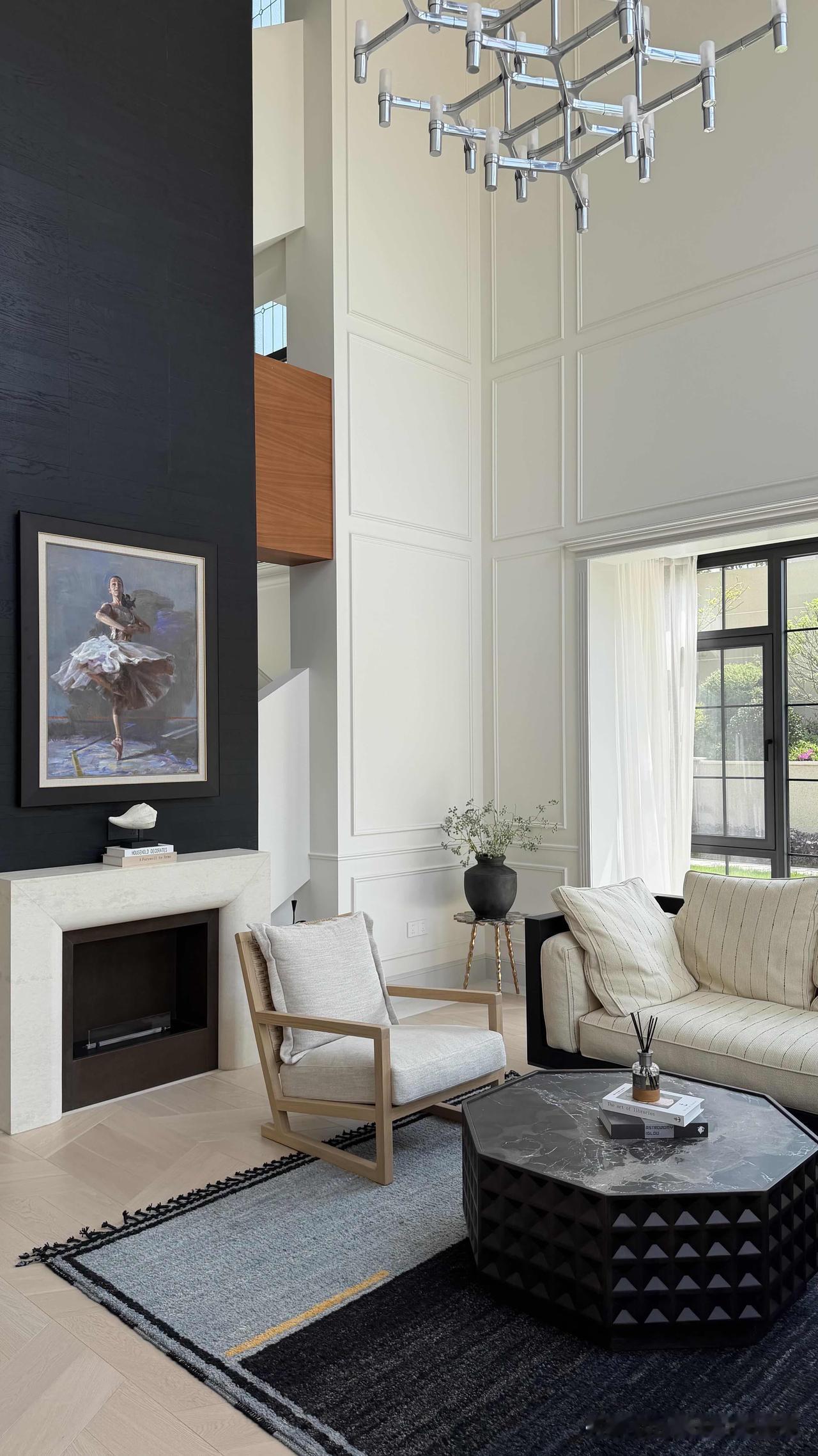 • 黑色木饰面壁炉墙作为中心焦点,搭配白色简约护墙板,靠色彩对比撑起挑空气场,没有多余线条却自带法式的规整感