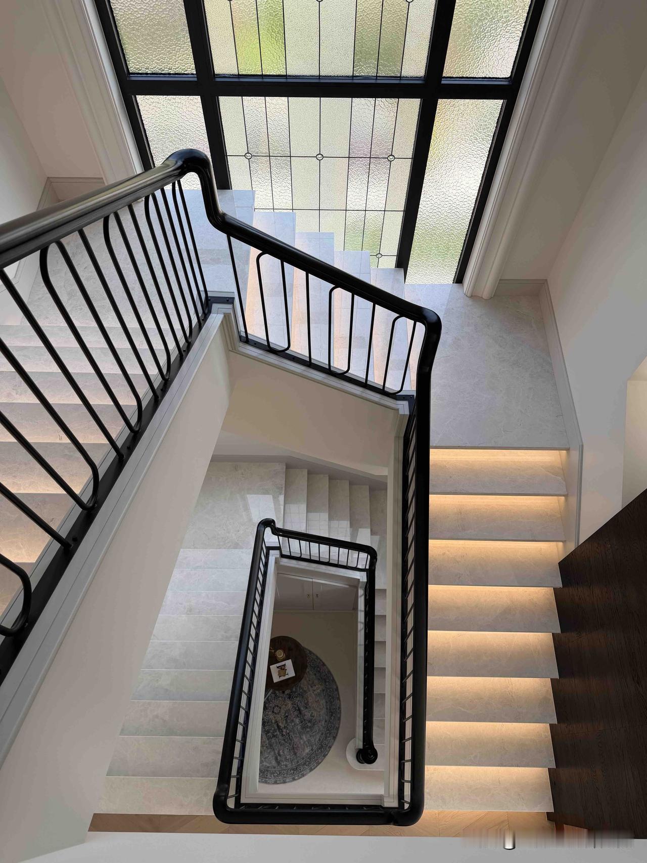 6米挑空的核心区,我放弃了传统法式的护墙板满墙,反而用黑白撞色做了视觉减法: