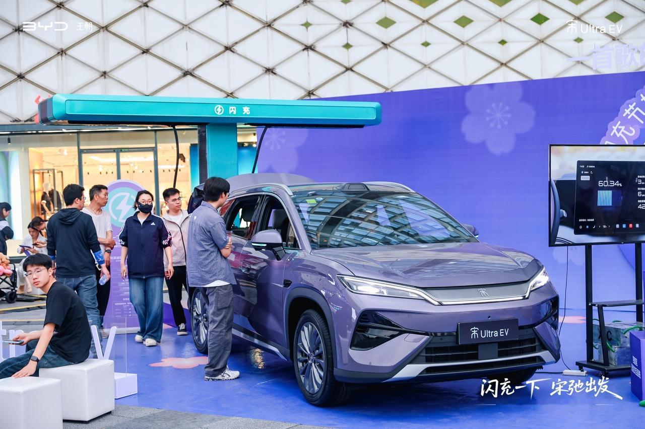 真的亲眼见证后,才知道现在的新能源车补能技术已经能够做到和燃油车加油同速了。这次展示的车型是宋Ultra EV,5分钟就能从10%充到70%,能够增加数百公里的行驶里程。