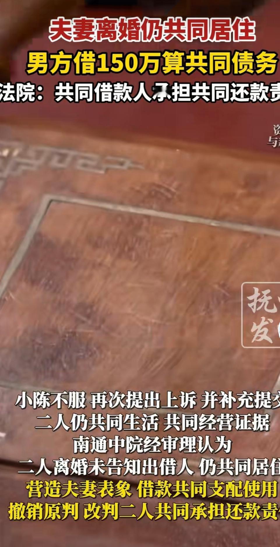 江苏南通,一对小夫妻离婚不离家,不仅在一起生活,还共同经营者酒店和蔬果店,对外还是以夫妻名义,然后老公因为生意需要多次向合作伙伴借款150万元,借款都是他一个人签字,而老婆不仅仅都在场,一部分的款项也都汇入老婆的账户上,到了时间,因为无法偿还这150万,合作伙伴就起诉于法院,法院认为,夫妻已经离婚,再说都是老公签字,就认定借款为老公个人债务,让他独自偿还,但是合作伙伴不服,再次提起上诉,认为两人虽然离婚,仍然共同生活,共同经营的生意,再说两人离婚并没有告知合作伙伴,借款也是共同支配使用,应该两人共同承担还款责任,法院判了。