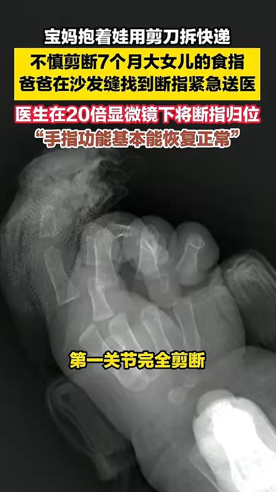 悲剧还是发生了!就在山东济南,一位妈妈抱着七个月大的女儿芙芙拆快递,结果一不小心,用剪刀竟然把宝宝右手食指的第一关节给完全剪断了!想想都让人心疼,芙芙疼得哇哇大哭,妈妈瞬间慌了神,场面一度失控。幸好,爸爸眼疾手快,在沙发缝隙里找到了掉落的手指,火速把小宝贝送进了急诊室。