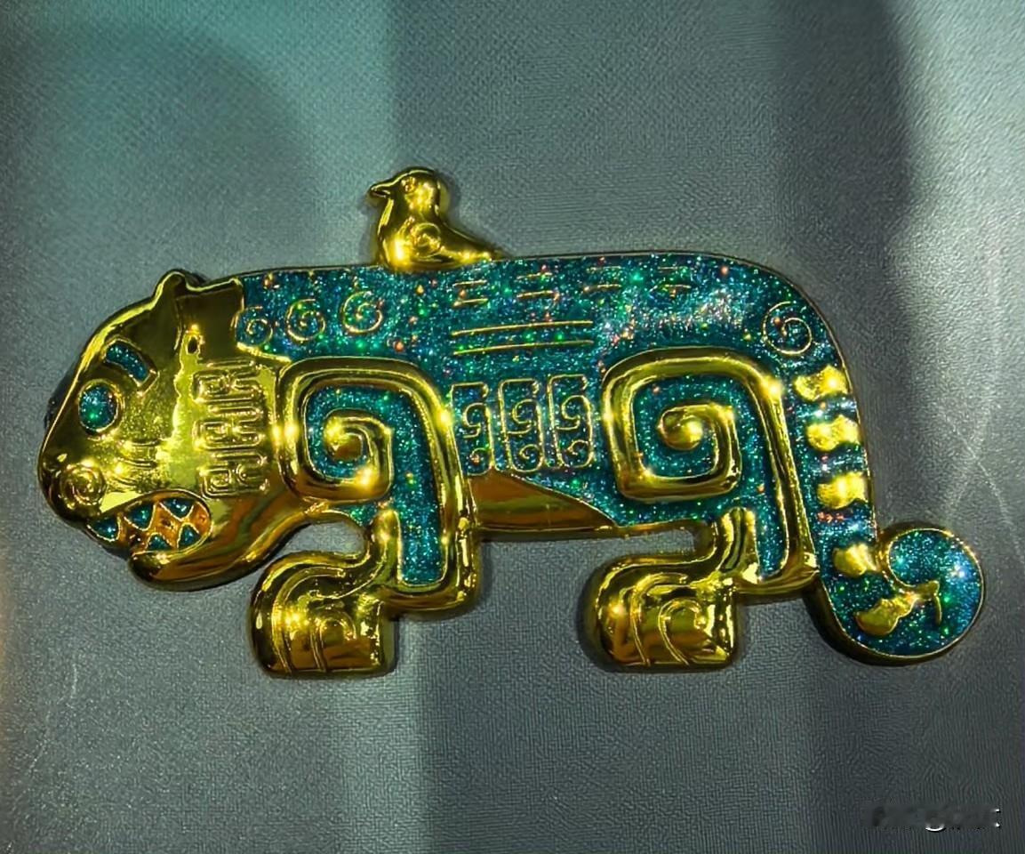 一只利齿獠牙的大老虎身上伏着一只小鸟。沅汰博物馆