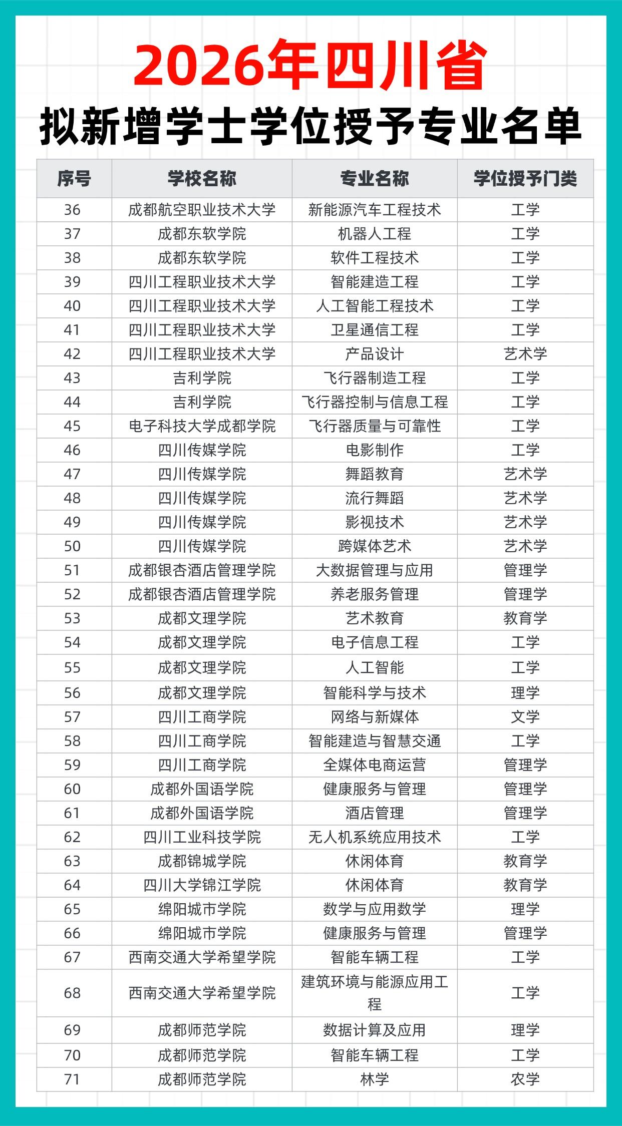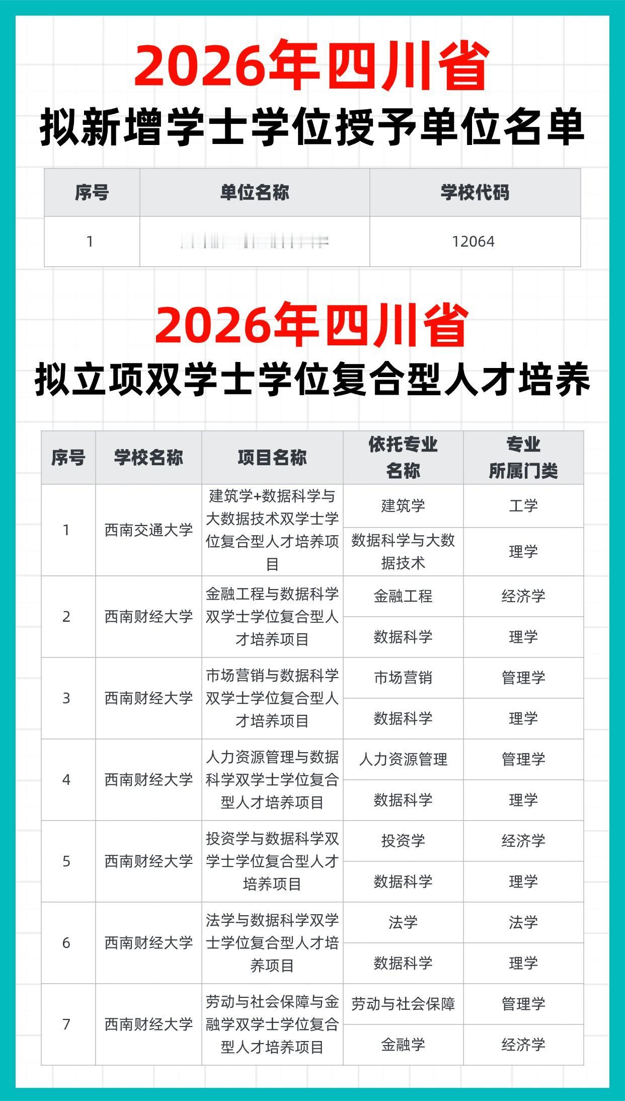 🔥四川公示!71个新专业+7个双学位项目来了! 省教育厅最新发布: ✅1个新增学士学位授予单位 ✅71个拟新增学士学位授予专业 ✅7个拟立项双学士学位复合型人才培养项目 快来看看有没有你关心的专业~🎓