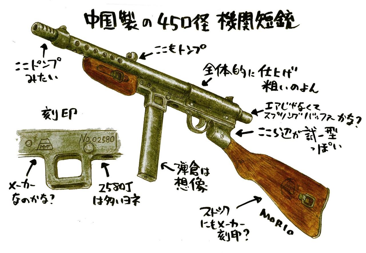 450 径 機関短銃,翻译:中国制造的.45 口径(11.43mm);2、枪口处箭头原文:ニコドンプみたい,翻译:看起来像是消焰器;3、上方准星附近箭头原文:ニコモトンプ,翻译:像是准星(前端照门/准星组件是AI自己加上去的,此处不确,准确在消焰器附近,此处其实是拉机柄,上端开有缺口以便瞄准);4、机匣中段箭头原文:全体的に仕上げ粗いのよん,翻译:整体做工十分粗糙;5、枪管末端、枪尾前端箭头原文:エアピードなくスプリングバッファかな?,翻译:没有气孔结构,应该是弹簧缓冲器吧?;6、枪身弯折处、机匣尾部箭头原文:ここら辺が試一型っぽい,翻译:这一带结构,看起来是试一型的样式;7、垂直弹匣箭头原文:弾倉は想像,翻译:弹匣部分为脑补绘制(脑补得十分准确,的确是使用类似的双排直弹匣);8、下方枪托箭头原文:ストックにもメーカー刻印?翻译:枪托上也有厂商刻印吗?(有);9、左下角铭文特写框标注左侧箭头原文:メーカーなのかな?翻译:这是厂商标识吗?(框内三角标 MMF,一般认为这是该兵工厂的标记,可能与东北有关);10、右侧箭头原文:2580 丁は外ヨネ,翻译:编号2580,为外来缴获品(国内保存的实物编号有比这个大多的,实际数量应有5000支左右,一般认为这是国内自行生产的,国外资料中也没有这种冲锋枪的介绍)。