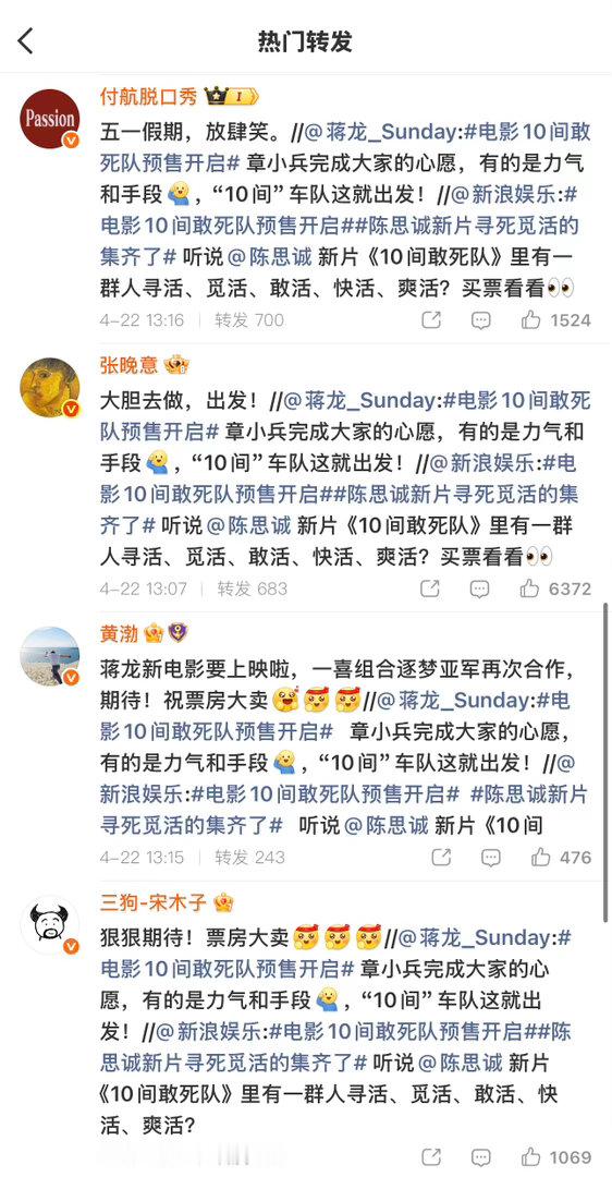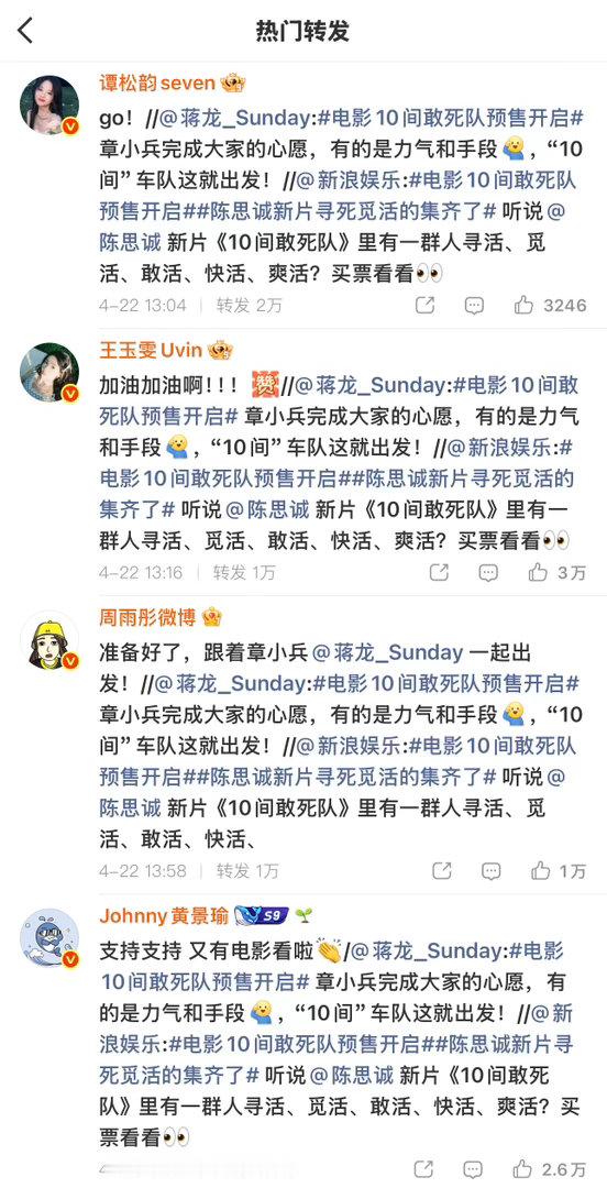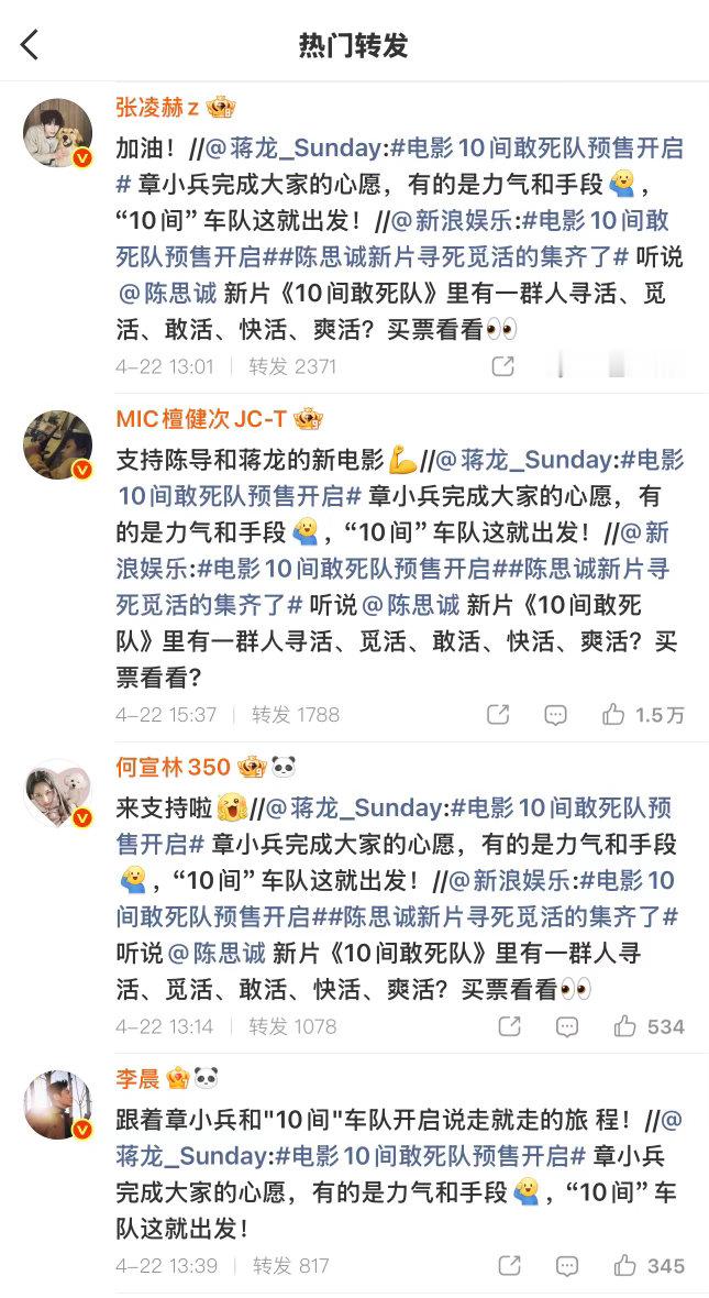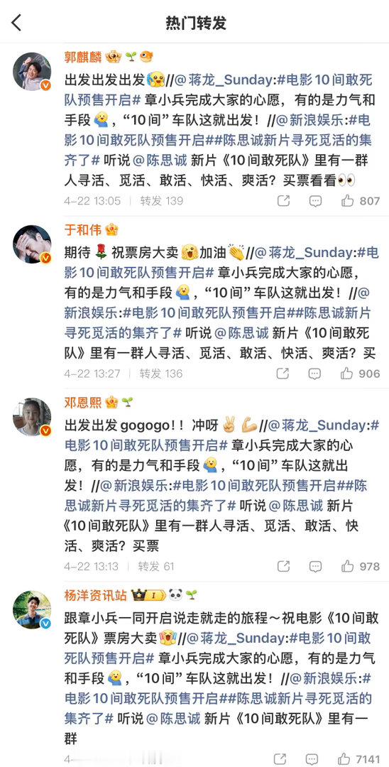 张凌赫檀健次黄景瑜为陈思诚电影打call众星为陈思诚新电影打call排面直接拉满!张凌赫、檀健次、黄景瑜、谭松韵、王玉雯等一众明星齐聚为《10间敢死队》打call,陈思诚导演新作果然值得期待,坐等五一档上映