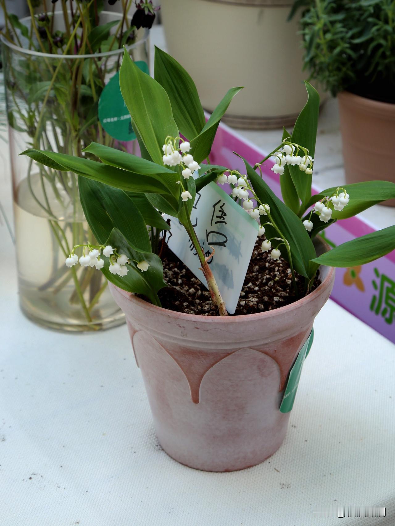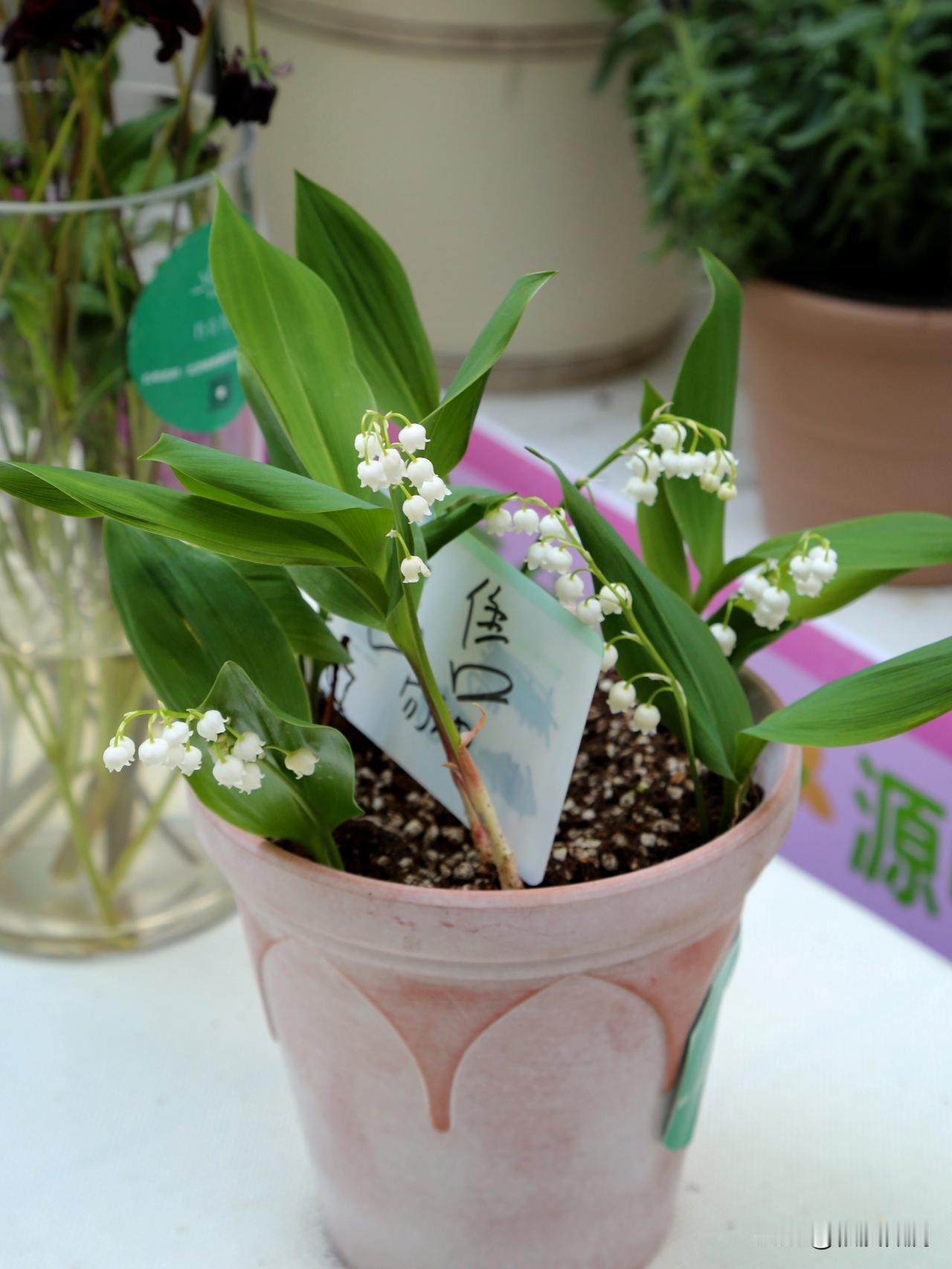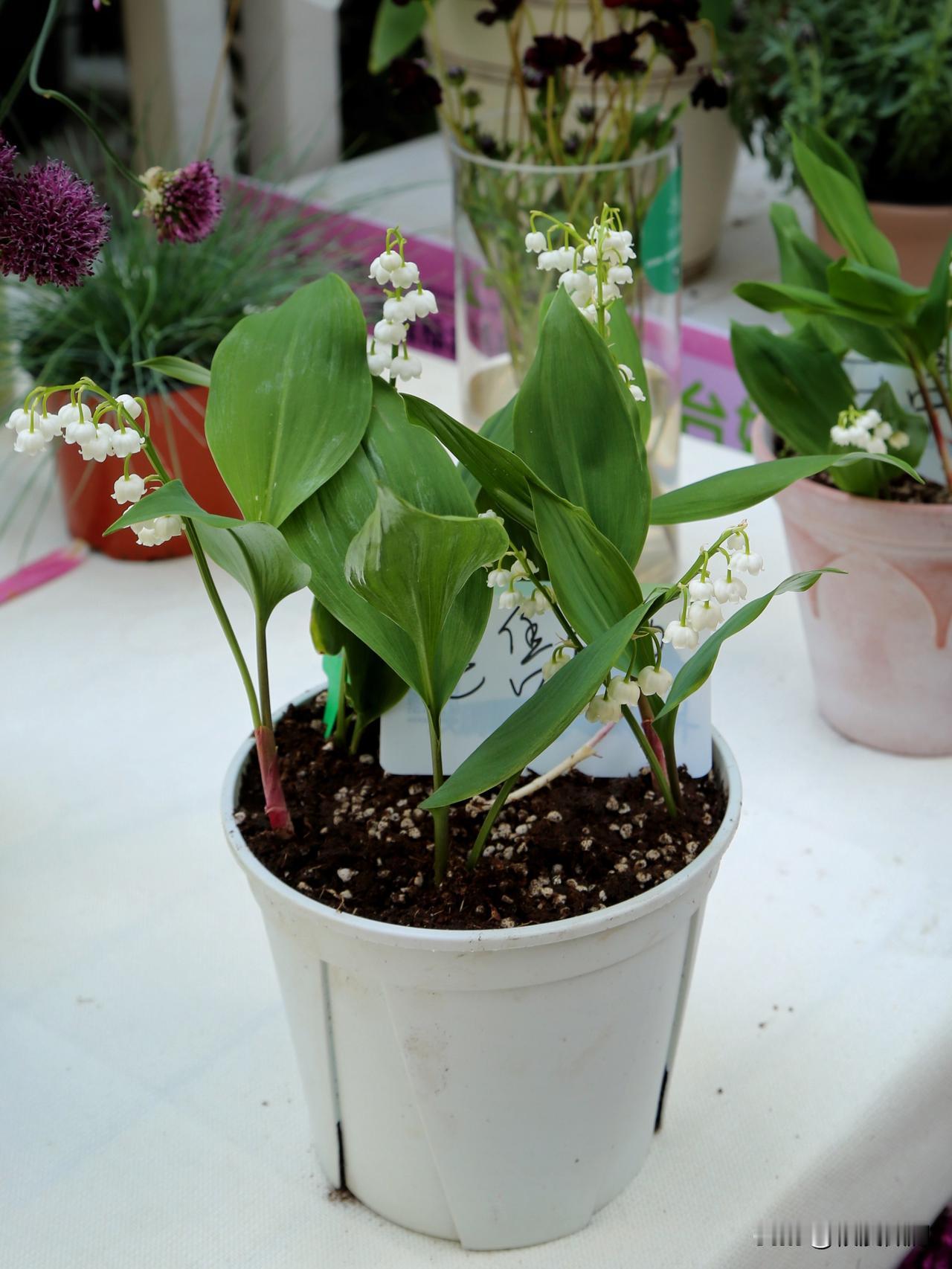 第一次近距离地观赏到了真正的铃兰,这回不是在图片上。铃兰的植株非常小巧,对于它来说一加仑盆已经足够大了。叶片和枝条都是鲜嫩的绿色,而点缀其中的只有指甲盖大小的铃兰花,才是它最动人的部分。洁白无瑕的小铃铛,一串串挂在枝头,简直像童话世界里才会有的植物。。芬兰于1967年正式将铃兰定为芬兰的国花,象征着纯洁与幸福。在欧洲,铃兰常常所为新娘手捧花出现在婚礼上。铃兰怕热,喜冷凉气候,在热带地区很难开花,花期在四五月。在花展上,这几盆展出的铃兰都已经被人订购了,可见这小小铃兰多受欢迎。