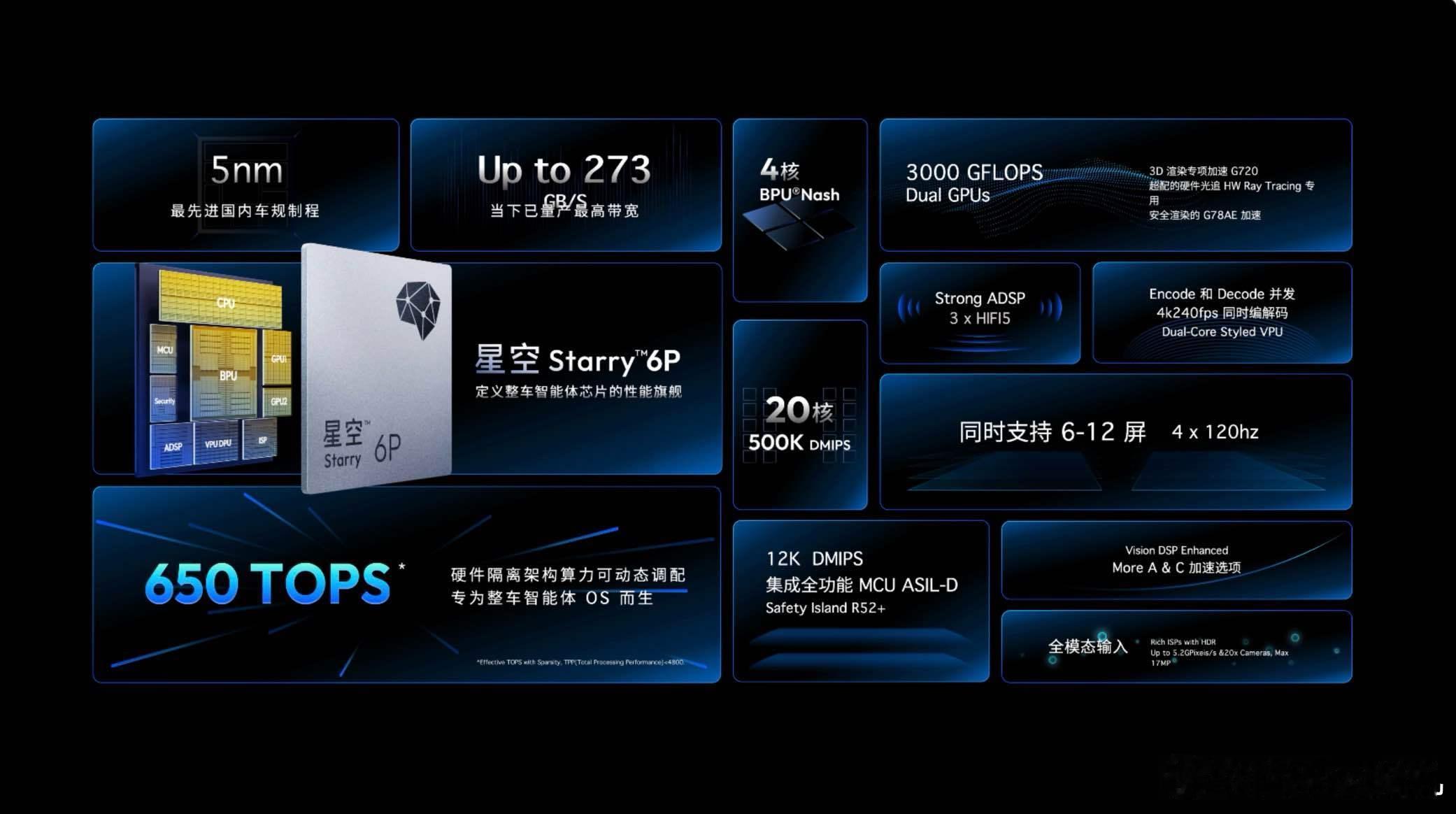 地平线发布星空 Starry 6P 芯片,这次是座舱和智驾的融合方案,核心数据是5nm制程、650TOPS算力和273GB/s 带宽。中国首款整车智能体芯片星空 北京·国家会议中心