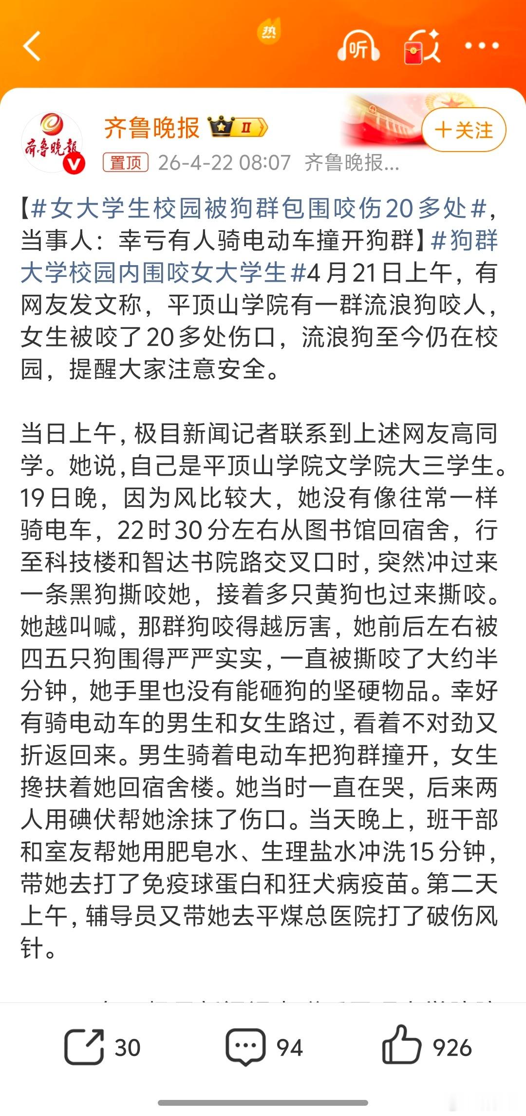 平顶山学院一女生被群狗咬伤20多处保安清理流浪狗,一群学生搞舆论,最后保安被开除