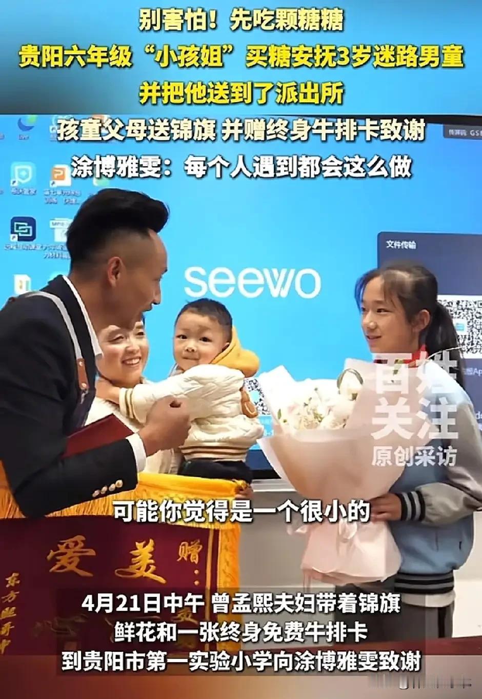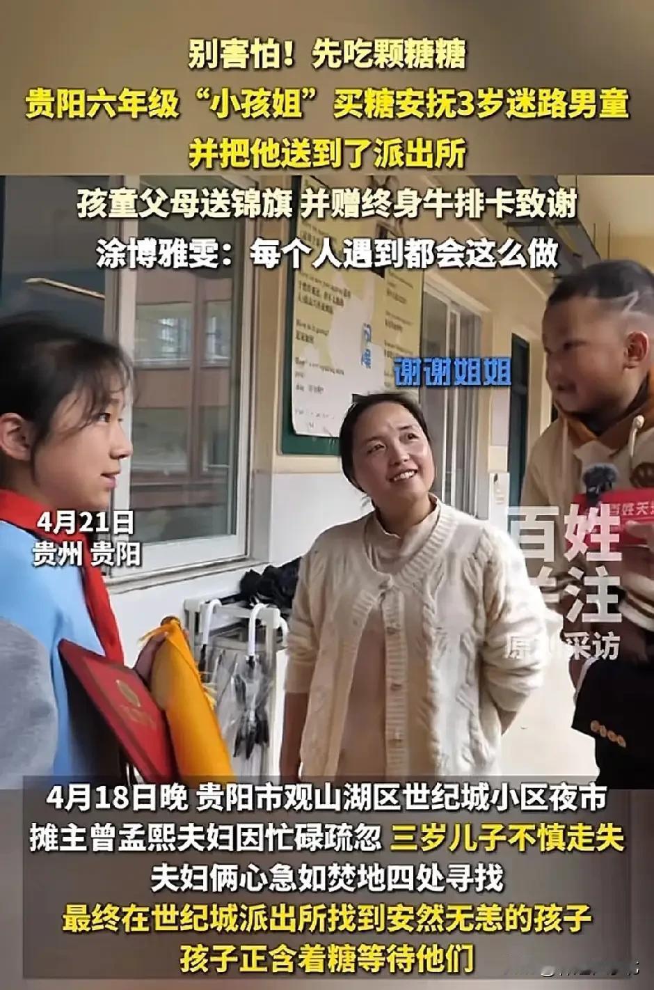 贵阳六年级小孩姐捡迷路男童,暖心护送至派出所! 贵州贵阳,暖心一幕刷屏全网!
