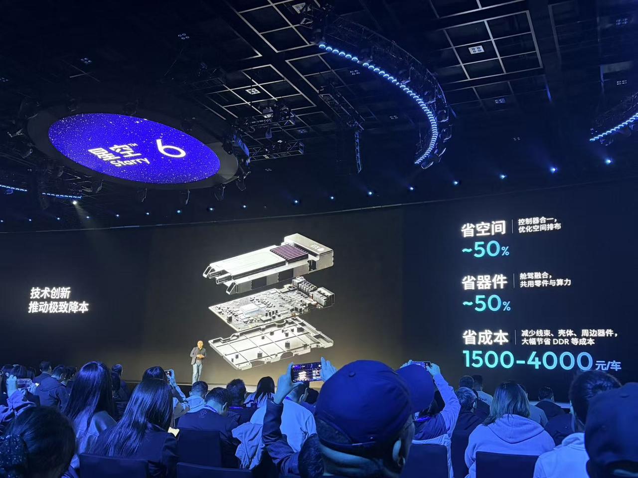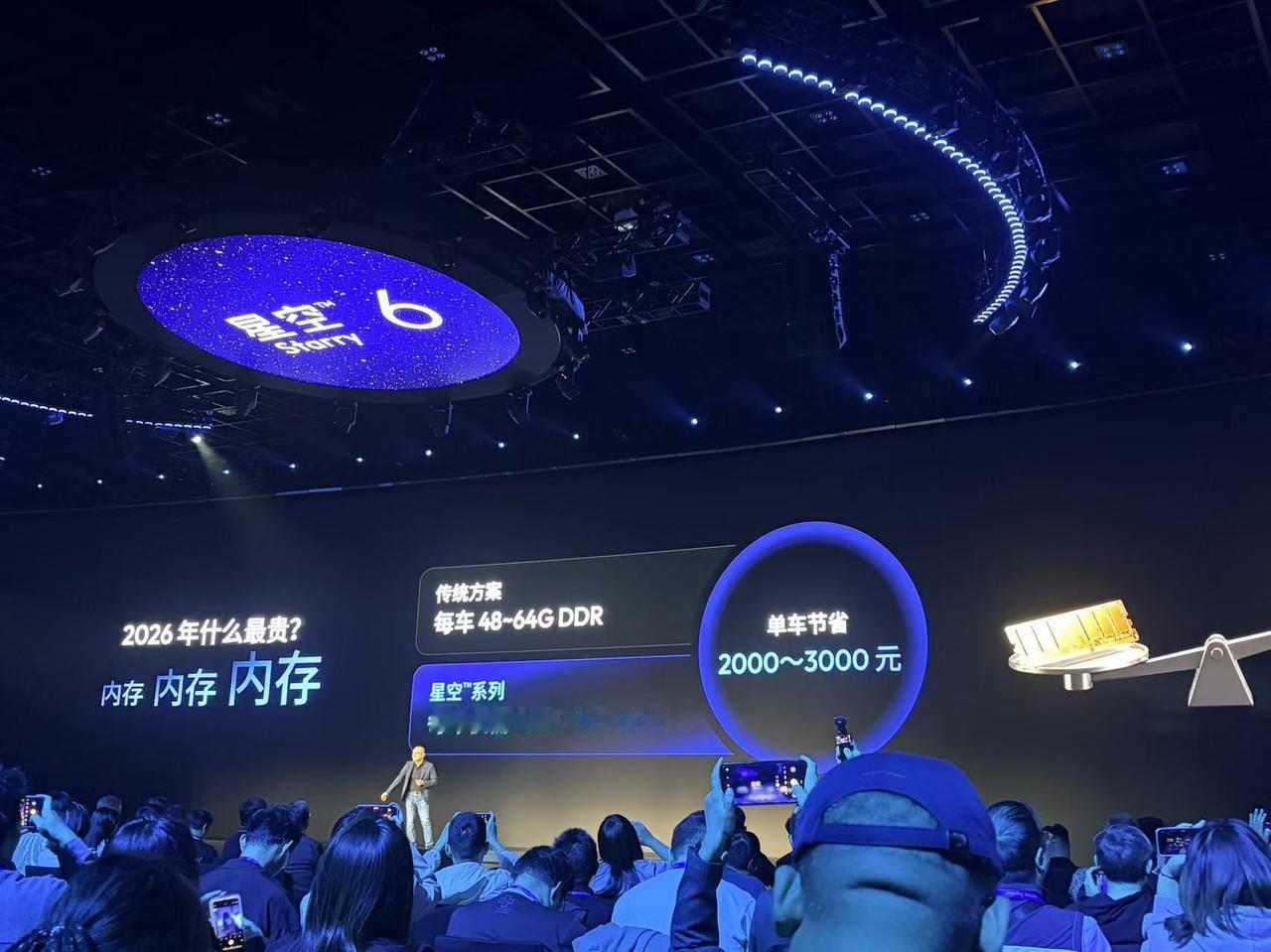 星空芯片的优势体现在,空间能节省50%,器件节省50%,整体成本更省,一台车能省1500-4000元,余凯现场算了一笔账,传统方案每台车要用48-64G内存,星空系列只要28-40G,内存单车能省2000-3000元