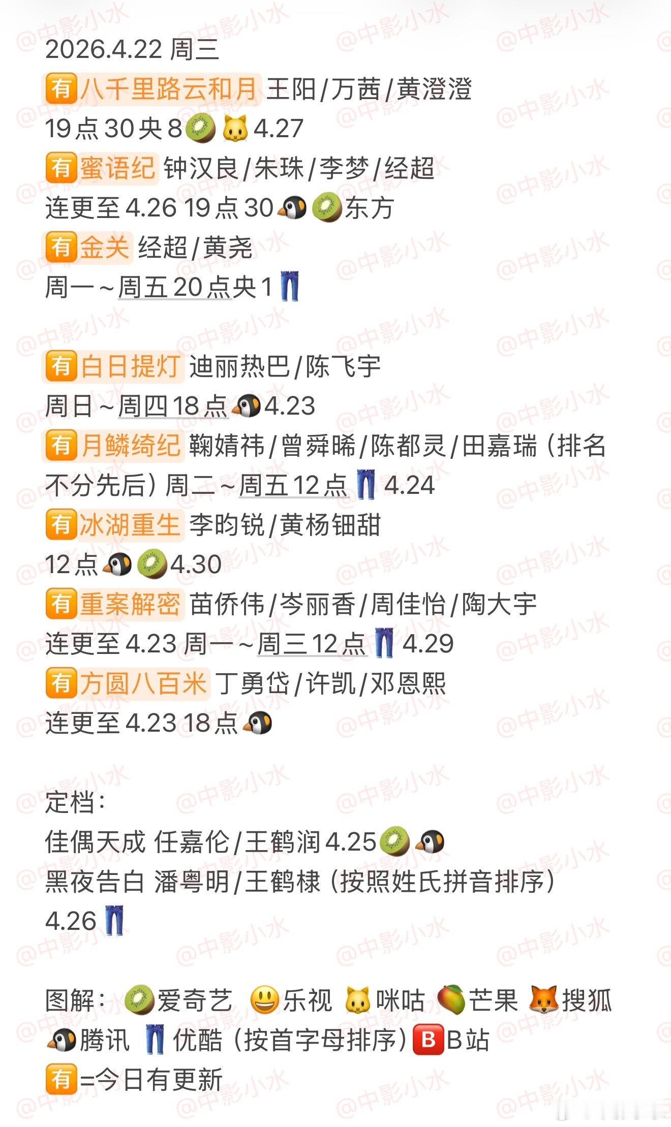 🈶白日提灯 迪丽热巴/陈飞宇🈶月鳞绮纪 鞠婧祎/曾舜晞/陈都灵/田嘉瑞(排名不分先后)🈶冰湖重生 李昀锐/黄杨钿甜🈶重案解密 苗侨伟/岑丽香/周佳怡/陶大宇🈶方圆八百米 丁勇岱/许凯/邓恩熙