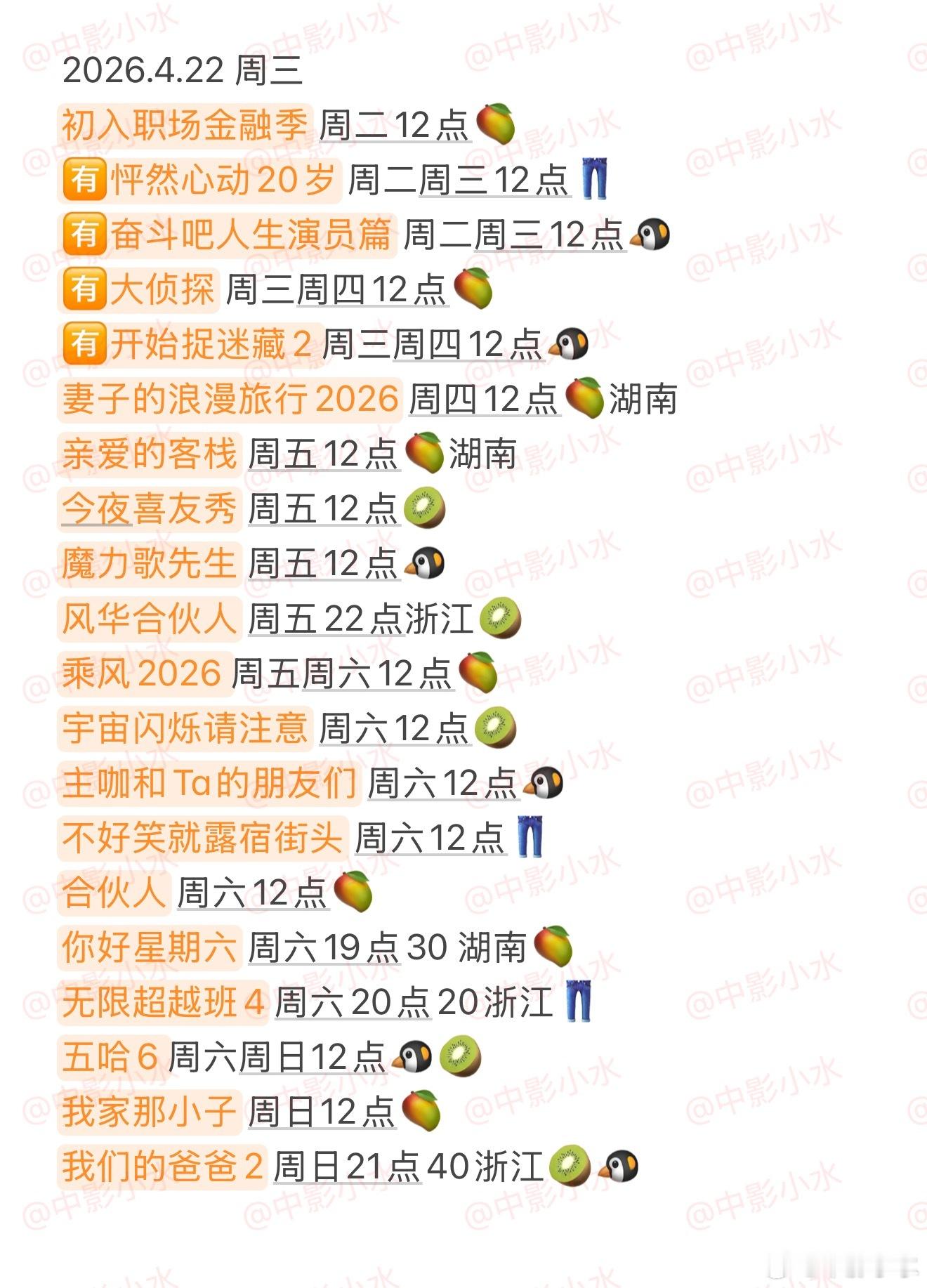 拯救剧荒 4月22日,今晚看点啥??图1 追剧日历 图2 综艺日历 图3 已完结剧集 🈶八千里路云和月 王阳/万茜/黄澄澄🈶蜜语纪 钟汉良/朱珠/李梦/经超🈶金关 经超/黄尧