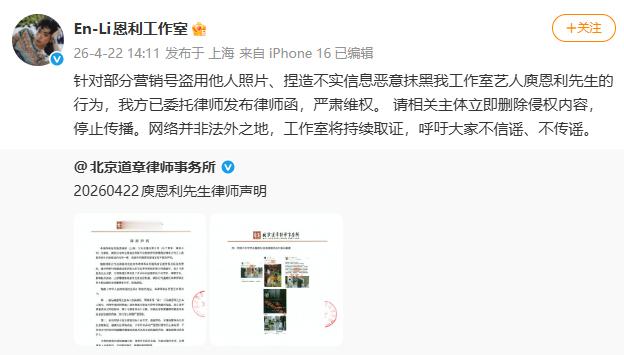 恩利方发律师声明庾恩利方发律师声明 针对部分营销号盗用他人照片、捏造不实信息恶意抹黑,庾恩利方已委托律师发布律师函,严肃维权。“请相关主体立即删除侵权内容,停止传播。网络并非法外之地,工作室将持续取证,呼吁大家不信谣、不传谣。”