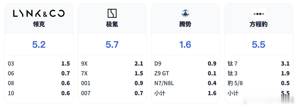 ◎ 极氪总体的销量为5.7万台,其中9x2.1万台拉高了整体销量,7x 销量为1.5万台,001和007分别为0.9万和0,7万台。