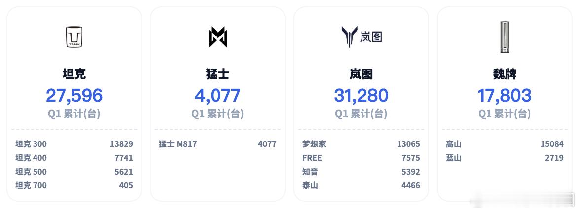 ◎ 猛士:猛士M817一季度销量4,077辆,和华为深度合作,定位高端越野市场,这个市场和坦克有点重叠。