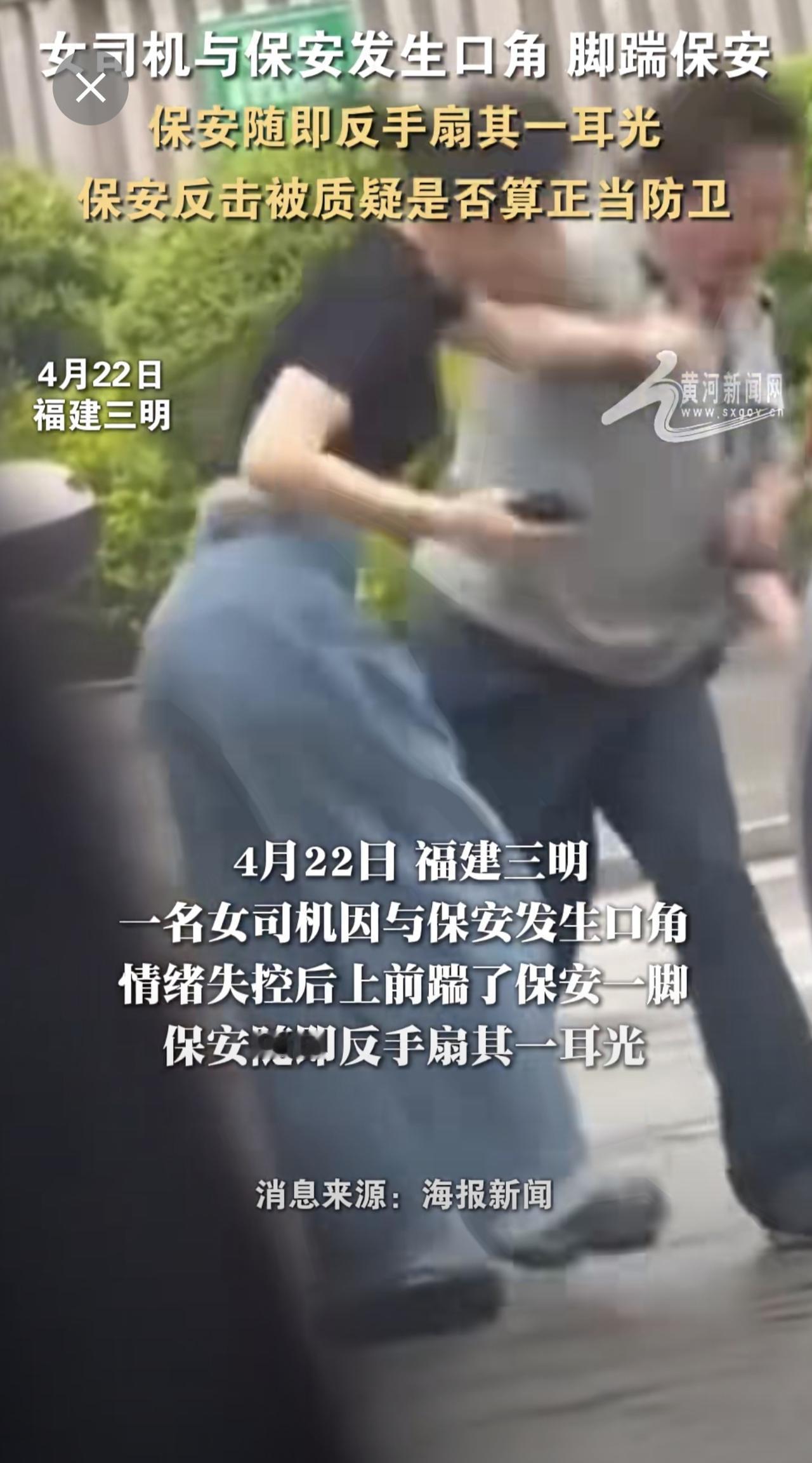 女司机与保安发生口角,脚踹保安。保安随即反手扇其一耳光。保安反击被质疑是否算正当