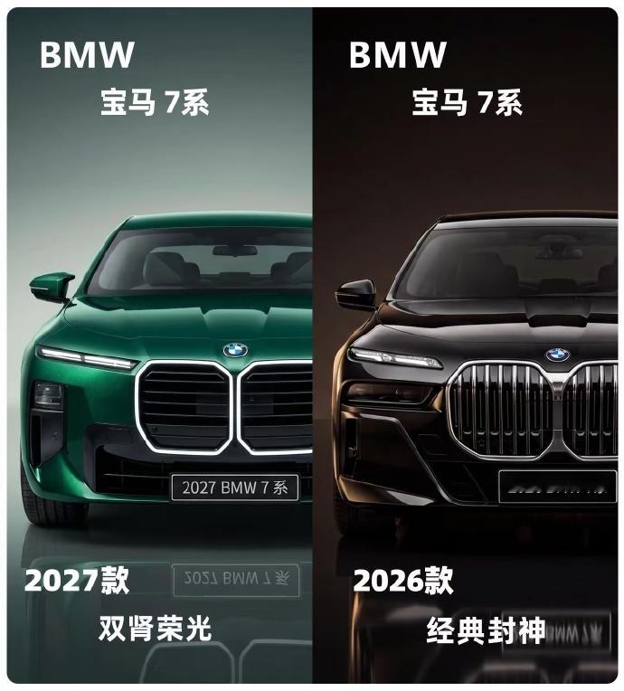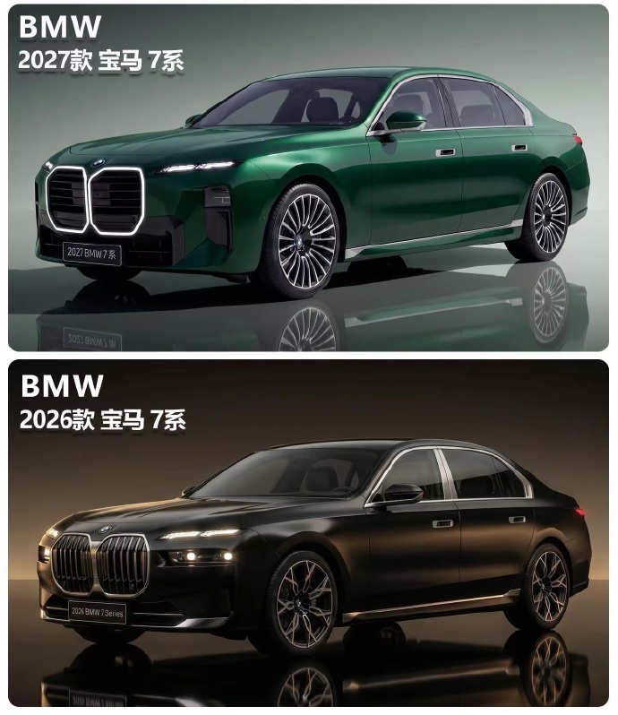 汽车 2027款宝马7系和现款版本对比图!前脸设计部分由竖向进气格栅变成了横向布局!而且更加平整!整体看起来更加精神了,相较于现款的发光猪鼻孔,新款的有点钢铁侠的意思!整个侧面倒没有任何变化,依旧是横平竖直的劳斯莱斯古思特的身影!尾部造型,在尾灯造型上进行了调整,变成了双条纹,尾部更加饱满。