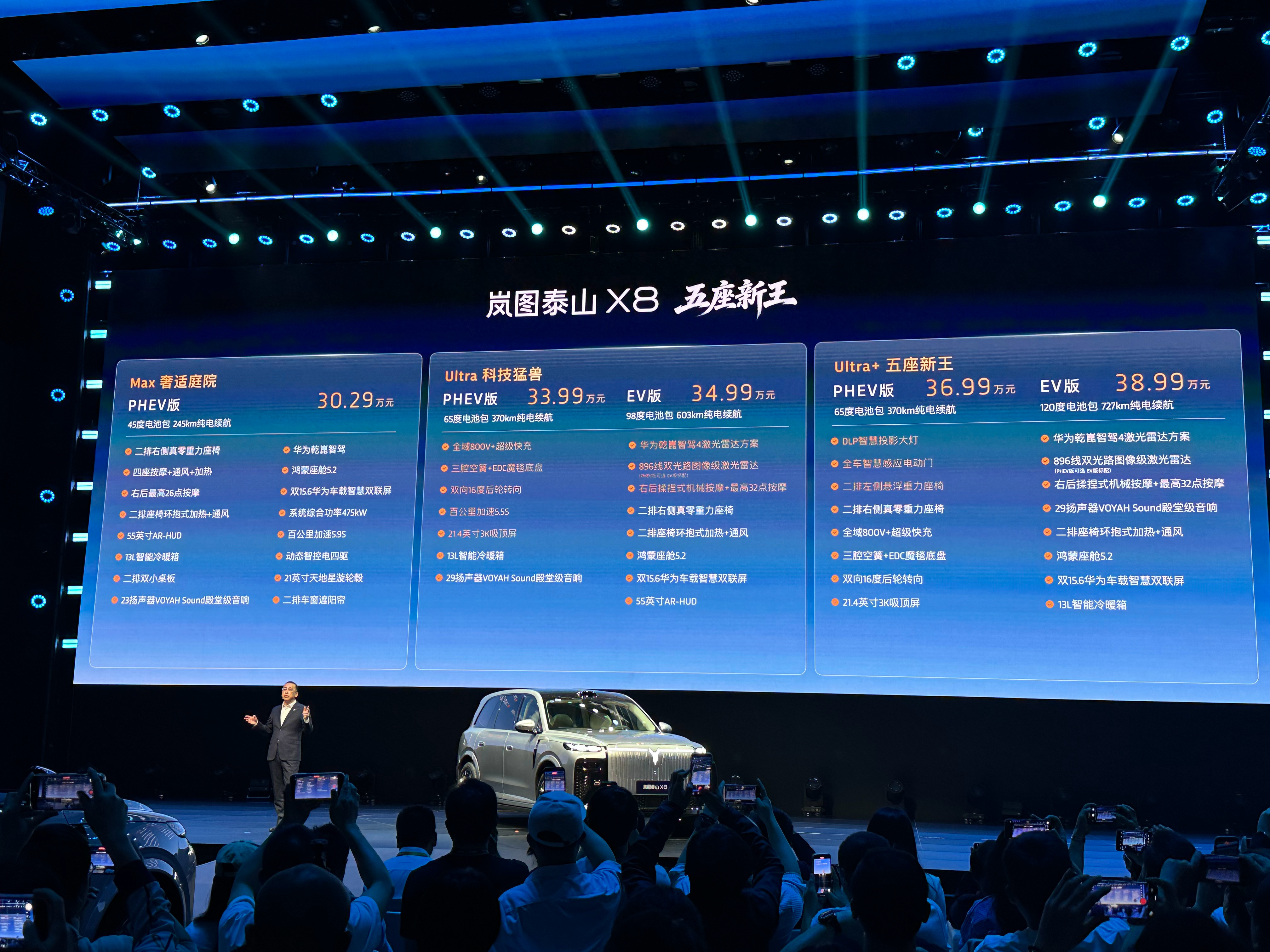 Max 睿适庭席 PHEV版:30.29万元Ultra 科技猛兽 PHEV版:33.99万元Ultra 科技猛兽 EV版:34.99万元Ultra+ 五座新王 PHEV版:36.99万元Ultra+ 五座新王 EV版:38.99万元岚图泰山X8五座新王 移动总统套房车企发布会现场狂发888杯奶茶30.29万起岚图泰山X8预售