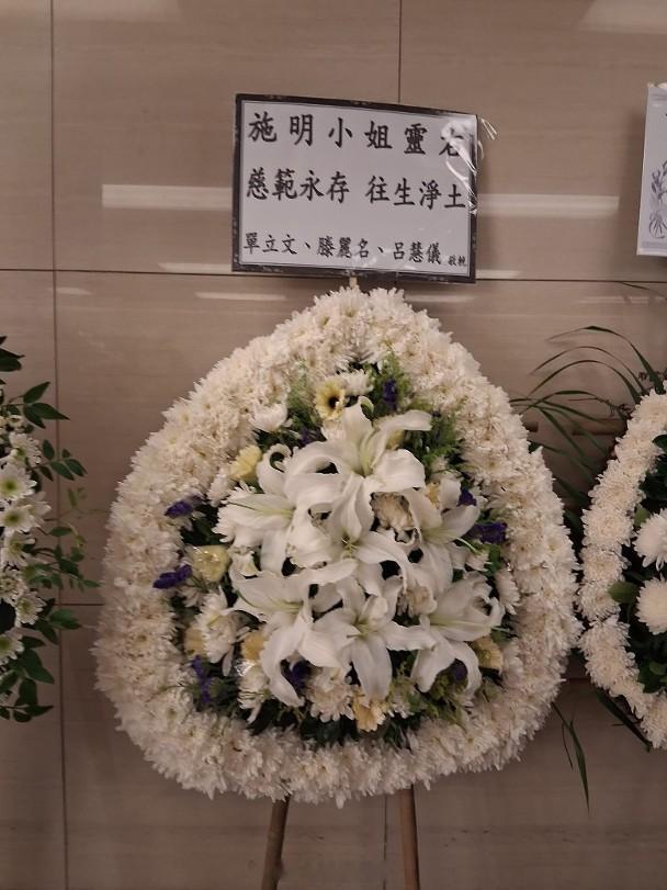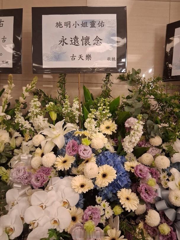靈堂門口放置一本吊唁冊,印有施明回眸一笑的樣子,上面寫上「往生淨土 方寶儀女士」。靈堂內放滿花圈,包括有古天樂、演藝人協會;靈堂的花圈有電視廣播有限公司、楊明和莊思明、譚玉瑛、唐韋琪等。