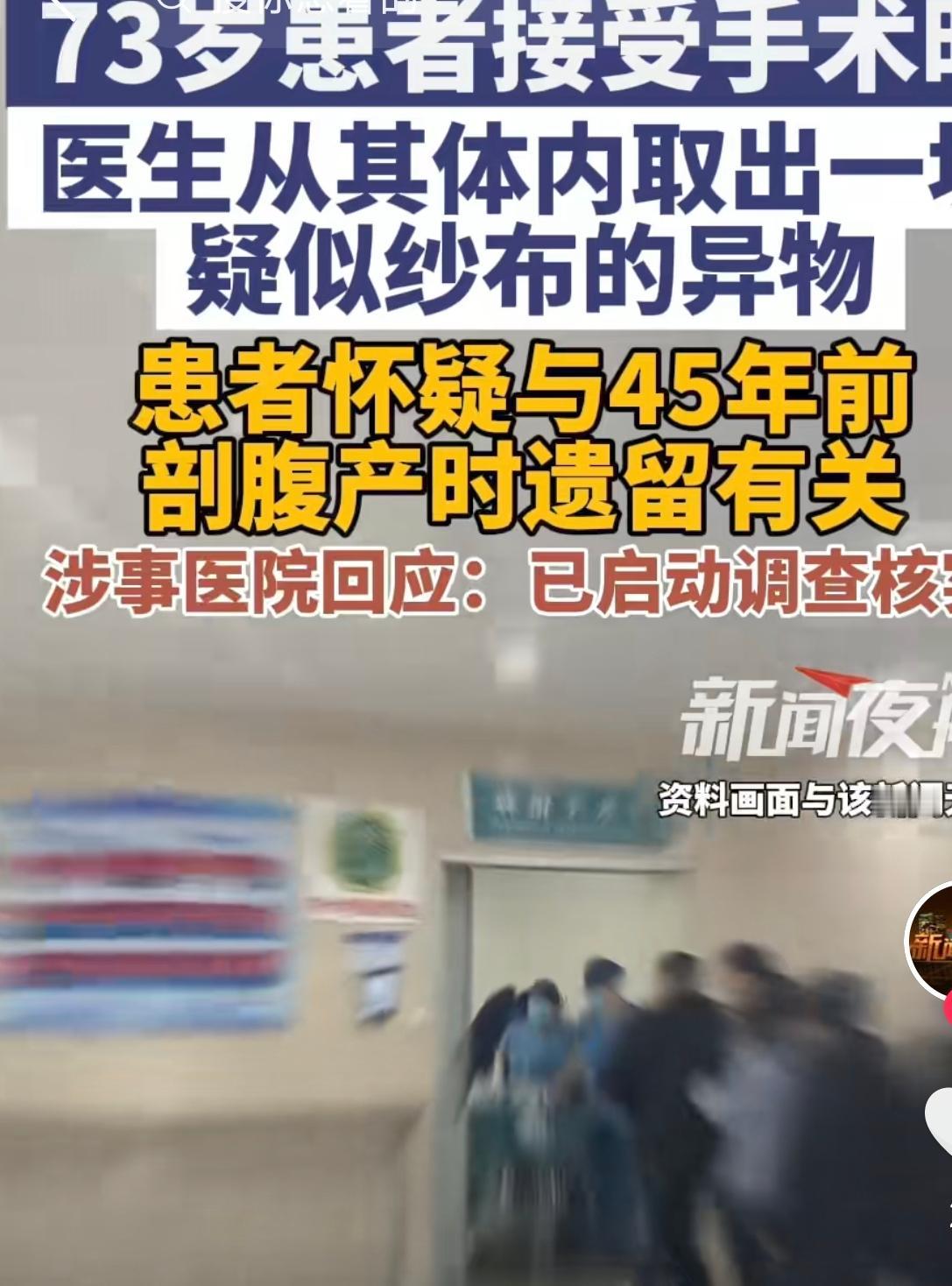 重庆,一位73岁老人最近在手术时,医生从老太太身体内取出一块在45年前在一家卫生院剖腹产手术时,未成取出的纱布,这让老人这么多年所受的痛苦,无法淡定,讨要说法,但是当年为老人手术的医生,一个去世,一个几十年都没有回来过,这就无法证实老人是否手术过,需要进一步核查,网友纷纷说:医生可以不在,但是只要这家医院在,就可以追责吧!目前医疗部门开始核实,调查取证。