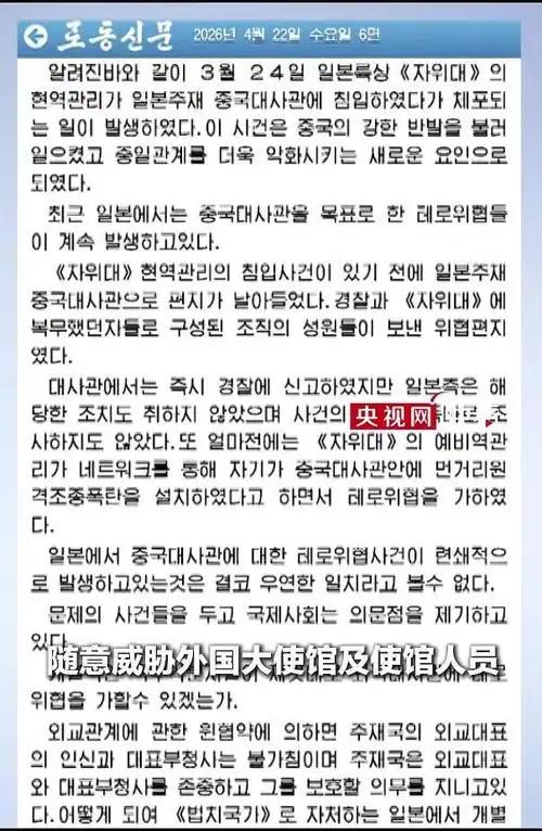 近期日本接连发生针对中国驻日使馆的恐怖威胁事件,包括一名自称应急预备自卫官的人称在馆内安装了遥控炸弹等连环威胁。4月22日,朝鲜劳动党机关报《劳动新闻》刊发评论文章,痛批日本当局纵容此类行径,仅以“表示遗憾”敷衍了事,要求日本予以承认、道歉、查明真相并惩处责任人。朝鲜指出,这是对国际法的粗暴违反与公然挑衅。