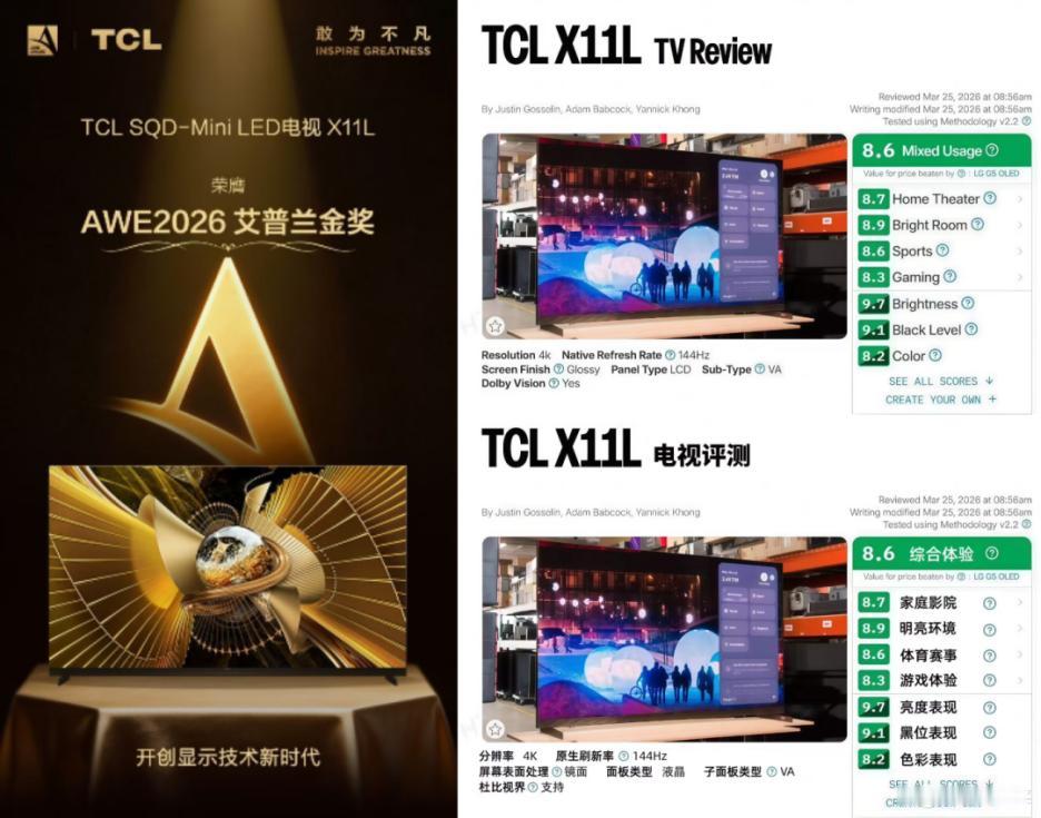 劝你选电视先了解下海外权威测试结果,最近应用了SQD-Mini LED技术的X11L 凭借 8.6 分的成绩,高居 LCD 电视榜单首位,得分更是直接超越 OLED 电视的平均水平。Rtings 是什么来头?它是国外公认最硬核、最客观公正的评测机构,从不搞虚头巴脑的营销套路,坚持随机购机、实测打分,产品优劣全凭真实数据说话。