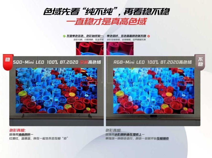 T7M Pro与旗舰产品一样,可以达到100%BT.2020全局高色域,画面边缘干净利落,色彩饱和均匀,完全没有普通电视可能出现的“串色”或“偏色”现象,色彩一致穩定,不互相染色。