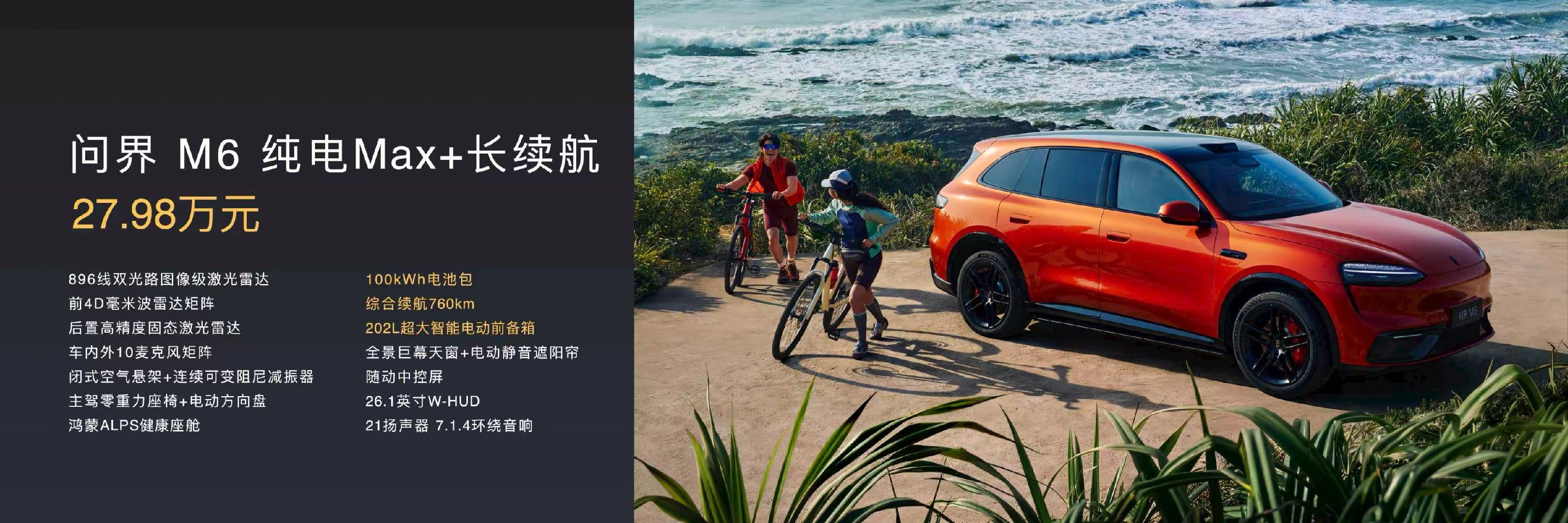 问界M6起售价25.98万元 问界M6增程Max+版25.98万元,问界M6增程Ultra版27.98万元,问界M6纯电Max+长续航版27.98万元,问界M6纯电Ultra版29.98万元。发布立即提车,最快五一开新车!6月1日前下定用户,可享至高56000元购车权益。问界M6动态评测首发