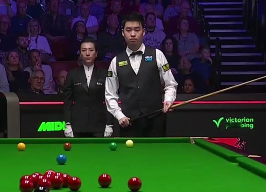 比赛的第一局,斯佳辉打进远台红球上手,冲击147满分杆。中间母球走位不佳,选择打粉球。最终,斯佳辉轰出单杆100分拿下首局。取得开门红。