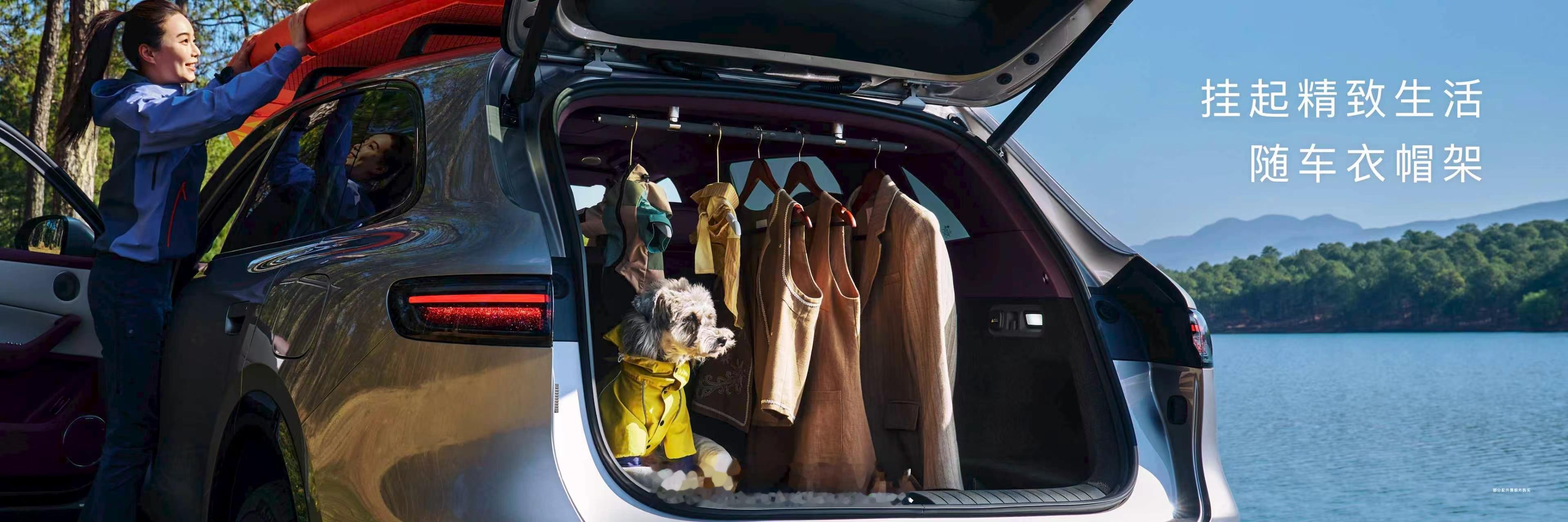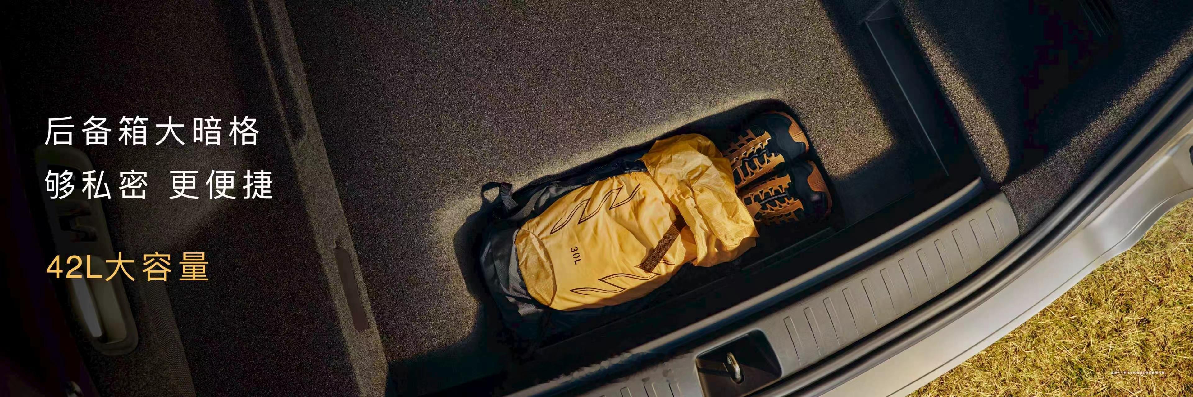 而且后备箱是840L容积,灵活百变,支持底盘升降,还有盖板下暗藏40L私密暗格,搭配拓展配件可化身移动衣帽架或单车车库。