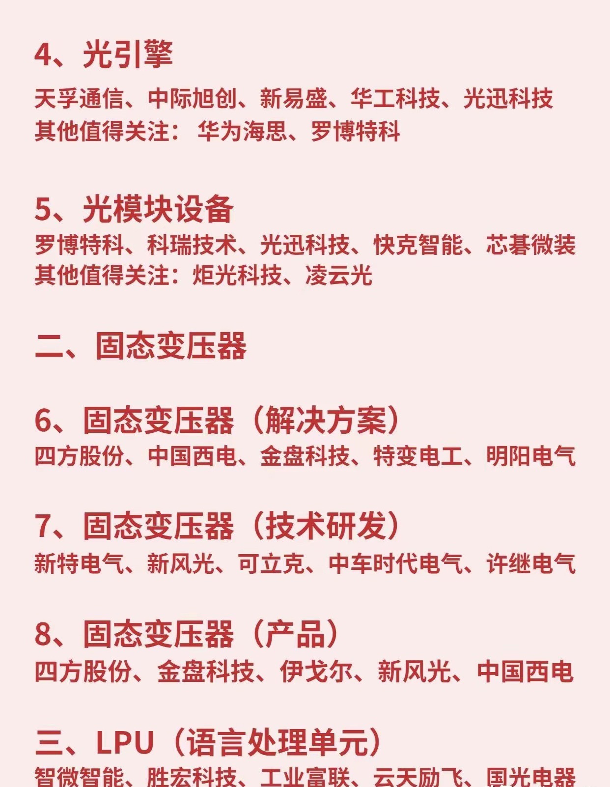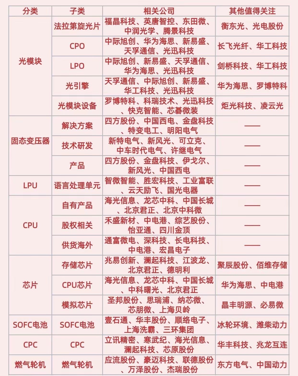 AI硬件16大细分领域热门公司1、法拉第旋光片福晶科技、英唐智控、东田微、中润光学、腾景科技2、CPO中际旭创、华为海思、新易盛、天孚通信、光迅科技3、LPO中际旭创、新易盛、天孚通信、华为海思、光迅科技4、光引擎天孚通信、中际旭创、新易盛、华工科技、光迅科技5、光模块设备罗博特科、科瑞技术、光迅科技、快克智能、芯碁微装6、固态变压器(解决方案)四方股份、中国西电、金盘科技、特变电工、明阳电气7、固态变压器(技术研发)新特电气、新风光、可立克、中车时代电气、许继电气8、固态变压器(产品)四方股份、金盘科技、伊戈尔、新风光、中国西电9、LPU(语言处理单元)智微智能、胜宏科技、工业富联、云天励飞、国光电器10、CPU(自有产品)海光信息、龙芯中科、中国长城、北京君正、北京中科微11.CPU(股权相关)禾盛新材、中电港、综艺股份、怡亚通、四川金顶12、CPU(供货海外)通富微电、深科技、长电科技、中电港、宏昌电子13、存储芯片兆易创新、澜起科技、江波龙、北京君正、德明利14、CPU芯片海光信息、龙芯中科、中国长城、中科曙光、北京君正15、模拟芯片圣邦股份、思瑞浦、纳芯微、芯朋微、上海贝岭16、SOFC电池壹石通、华丰股份、顺络电子、上海洗霸、三环集团17、CPC立讯精密、寒武纪、海光信息、澜起科技、芯原股份18、燃气轮机应流股份、豪迈科技、联德股份、万泽股份、杰瑞股份.⚠根据公开数据整理,仅作为科普,不作任何建议