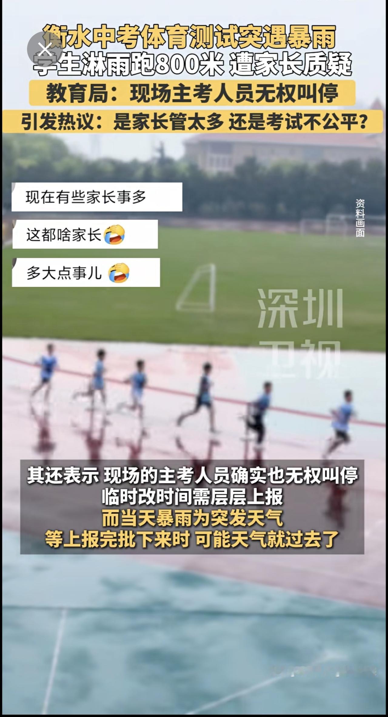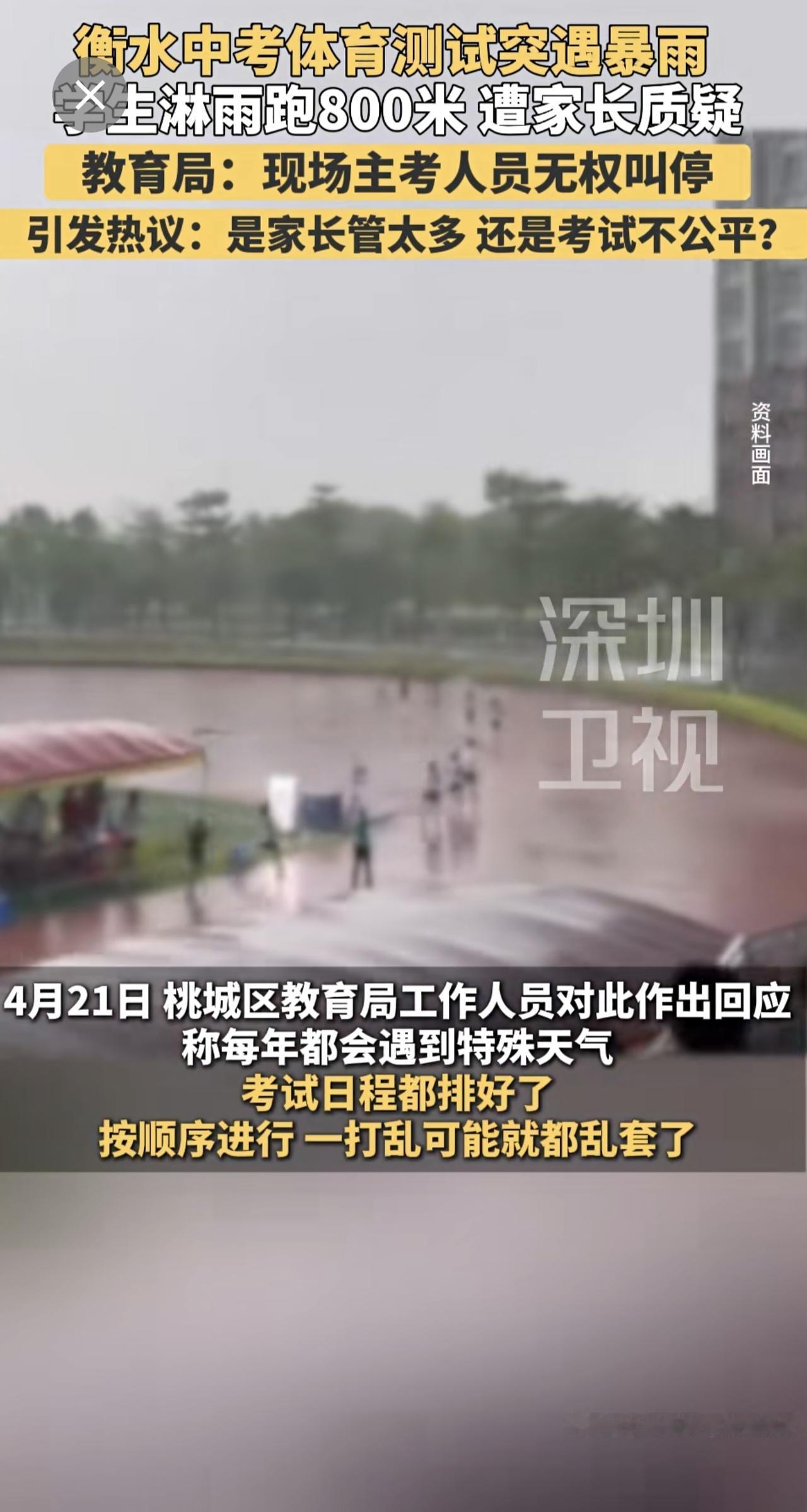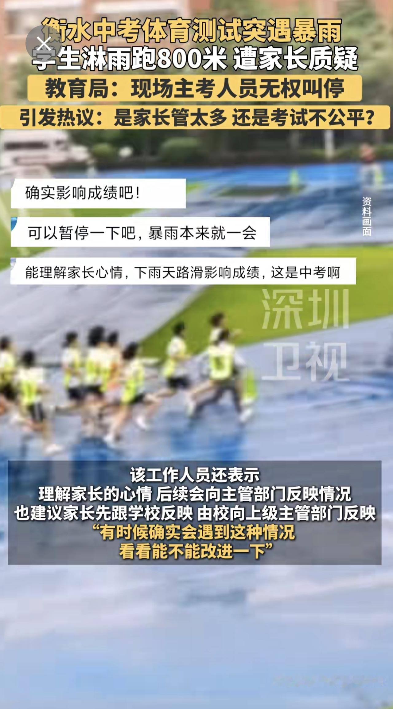 4月19日,河北衡水桃城区中考体育测试遇暴雨,学生淋雨参加800米跑步测试。有家长质疑“可能影响成绩的公平”“等暴雨过去再跑会不会更好”教育局:现场的主考人员无权叫停,当日暴雨是突发天气,需层层上报,等上报完批下来时,可能天气就过去了。学生淋雨跑800米 衡水教育局回应考生雨中考试