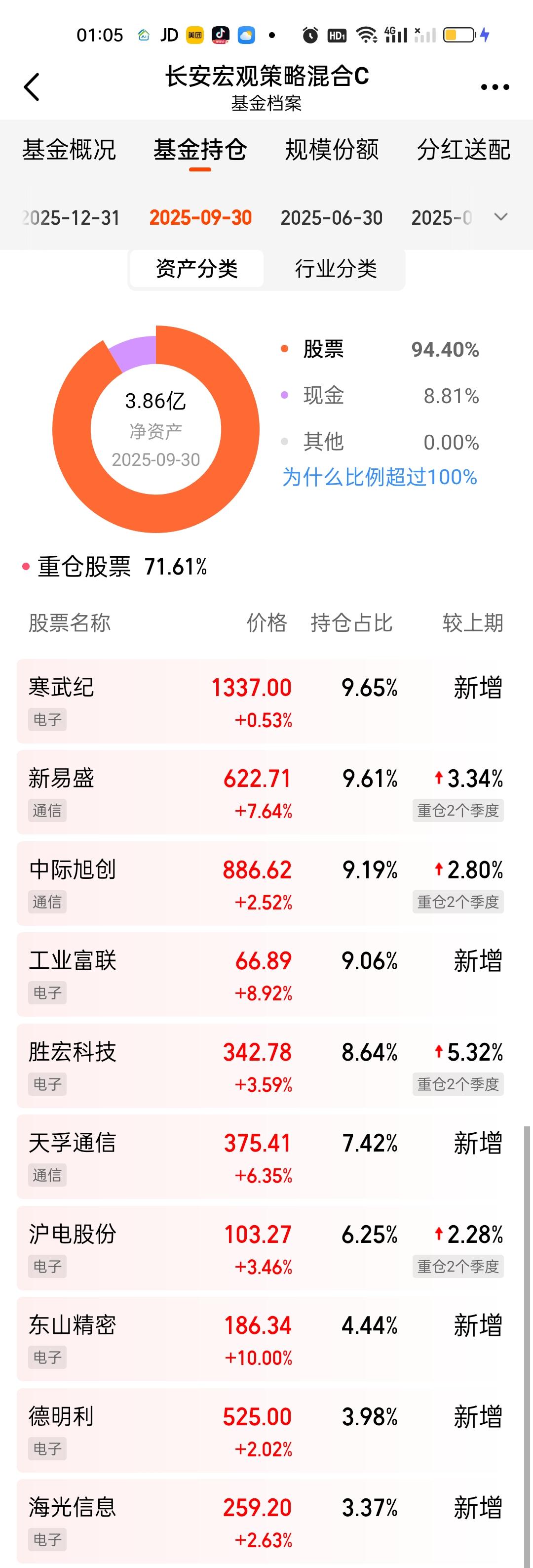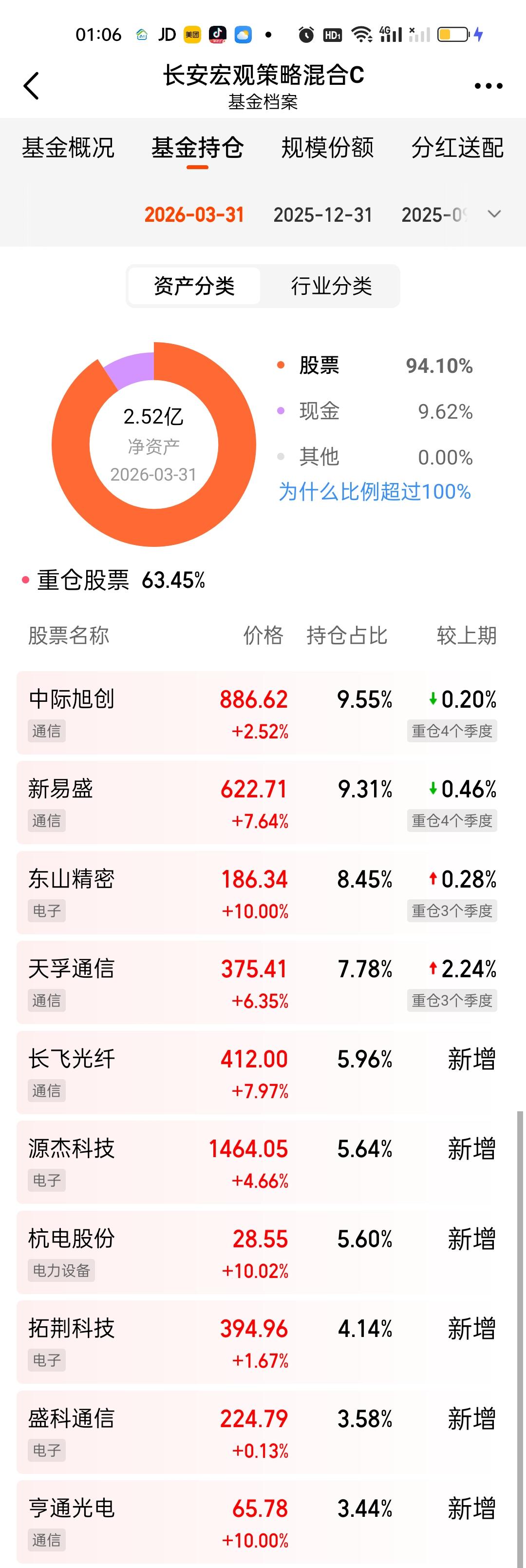 长安宏观策略这次规模不仅没有增加反而还缩小了,显得十分另类。这次调整了6只个股,新增了长飞光纤,源杰科技,杭电股份,拓荆科技,盛科通信,亨通光电。舍弃了寒武纪,工业富联,生益科技,胜宏科技,沪电股份,德明利。前十大重仓股占比也从71.36%下降到了63.45%。原有仓位只是增加了天孚通信的持仓占比,其它三只个股变化不大。总体来看,持仓风格并没有太过激进。