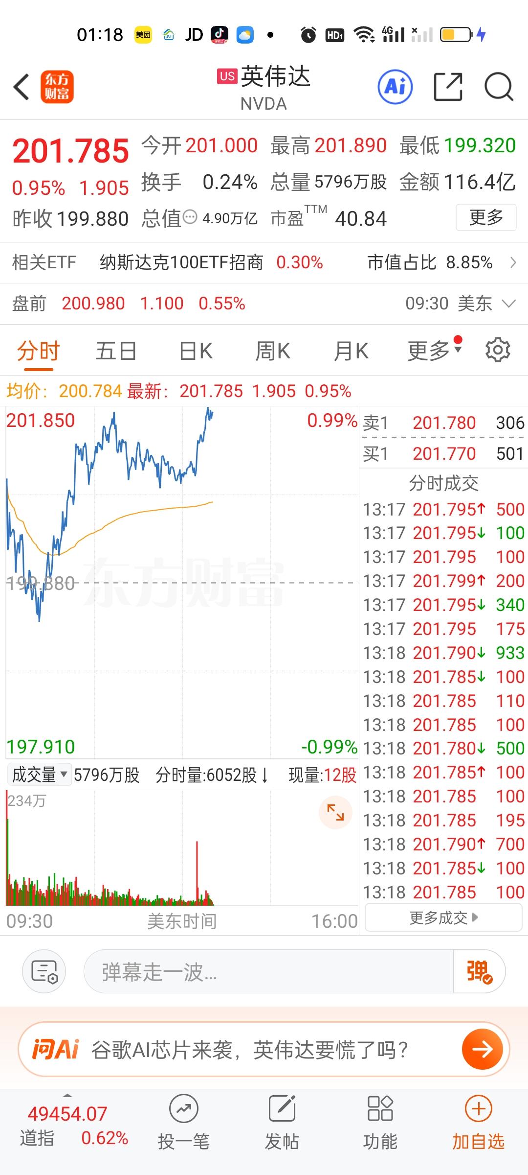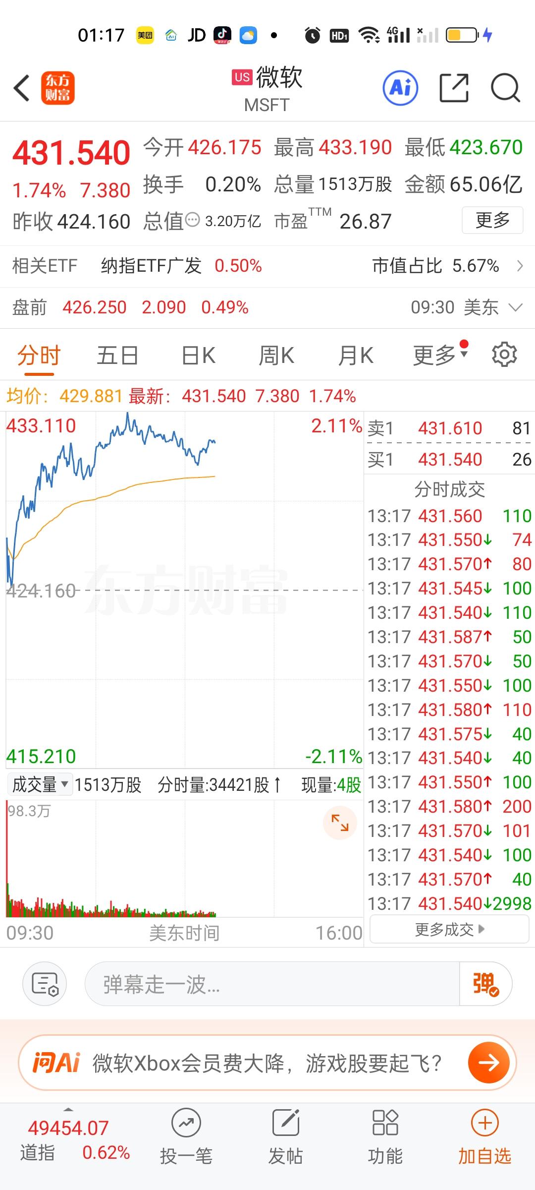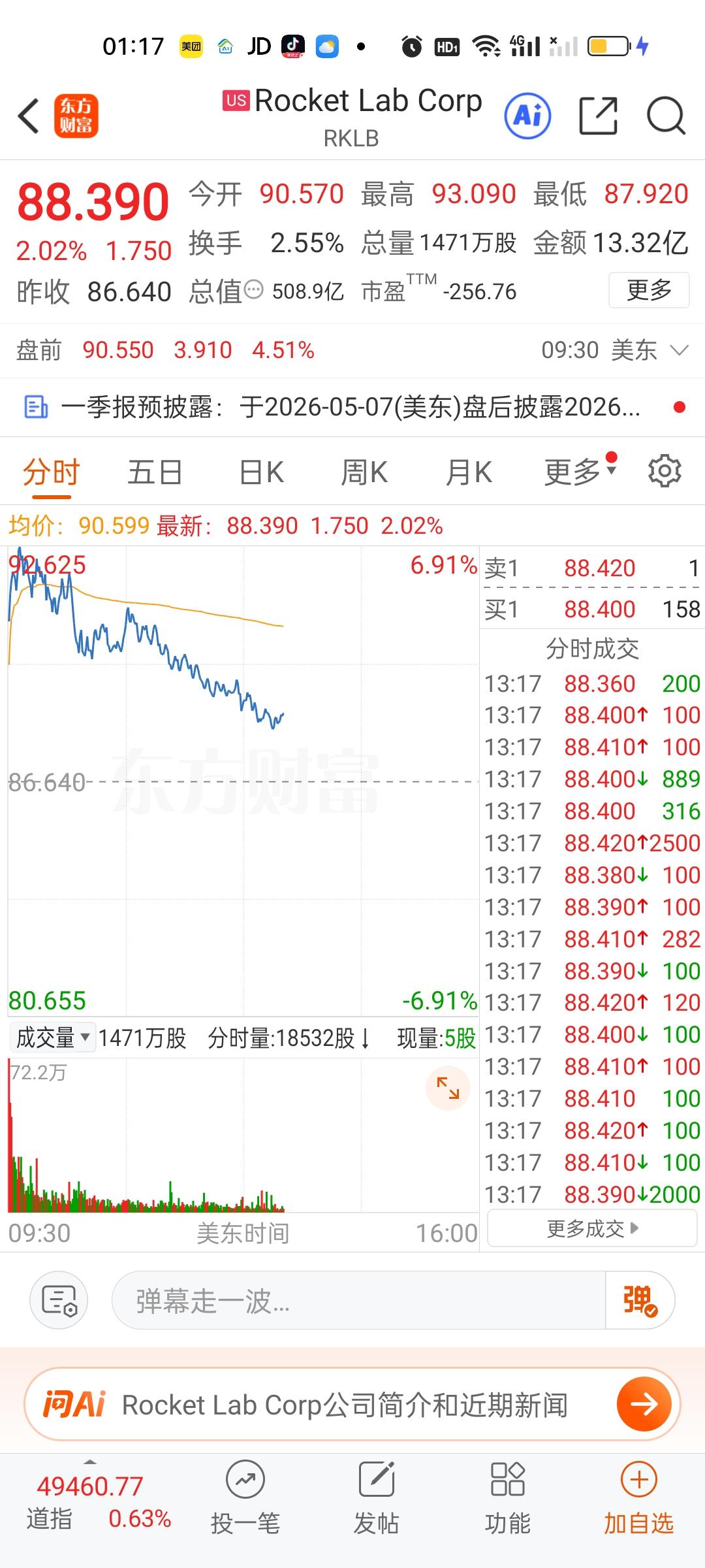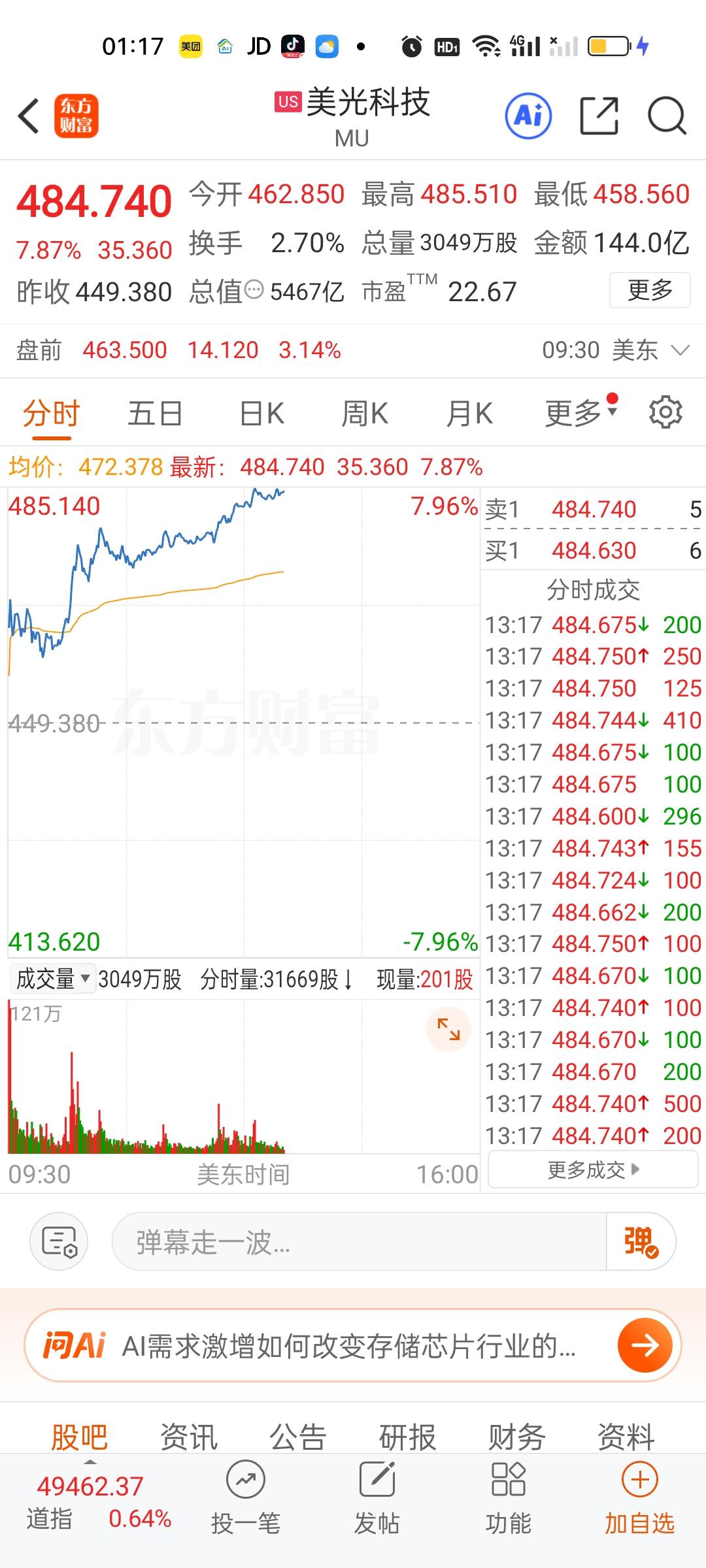 美股今天半导体和存储芯片走的相当不错,但商业航天今天是高开低走的。特斯拉,英伟达,英特尔走的很一般。苹果,微软目前还是上涨的状态。