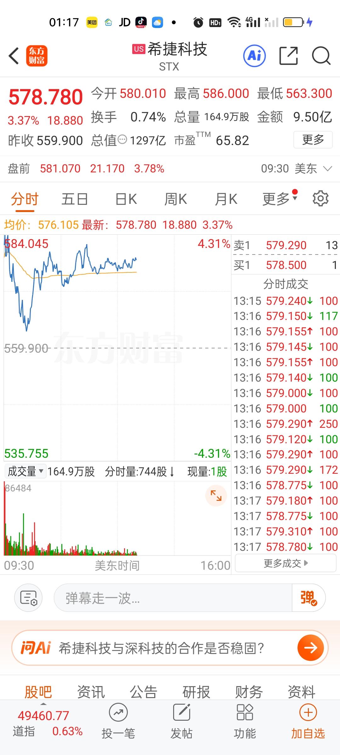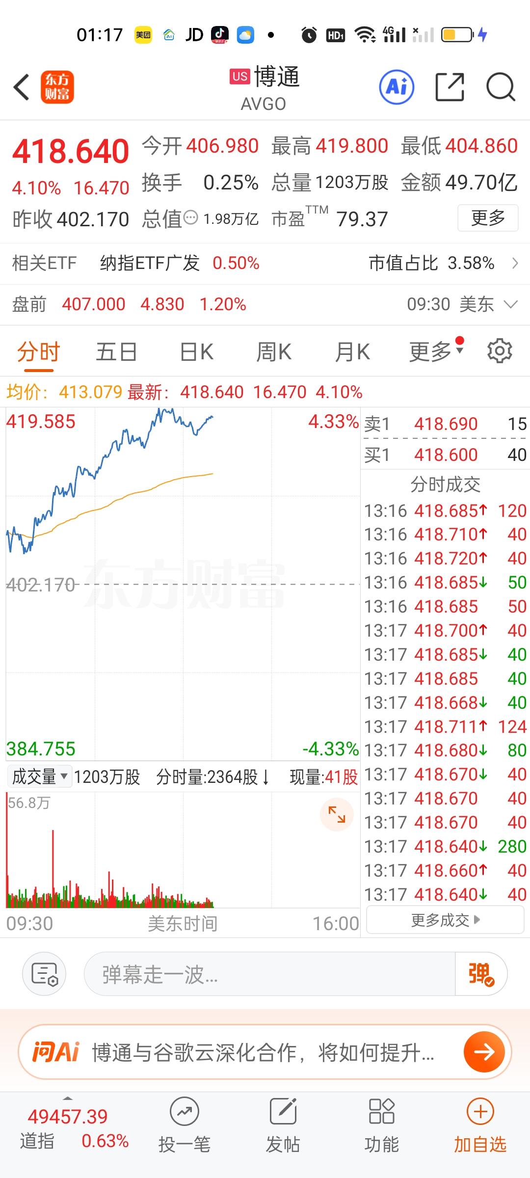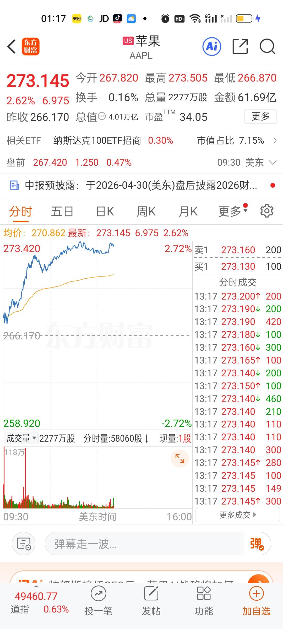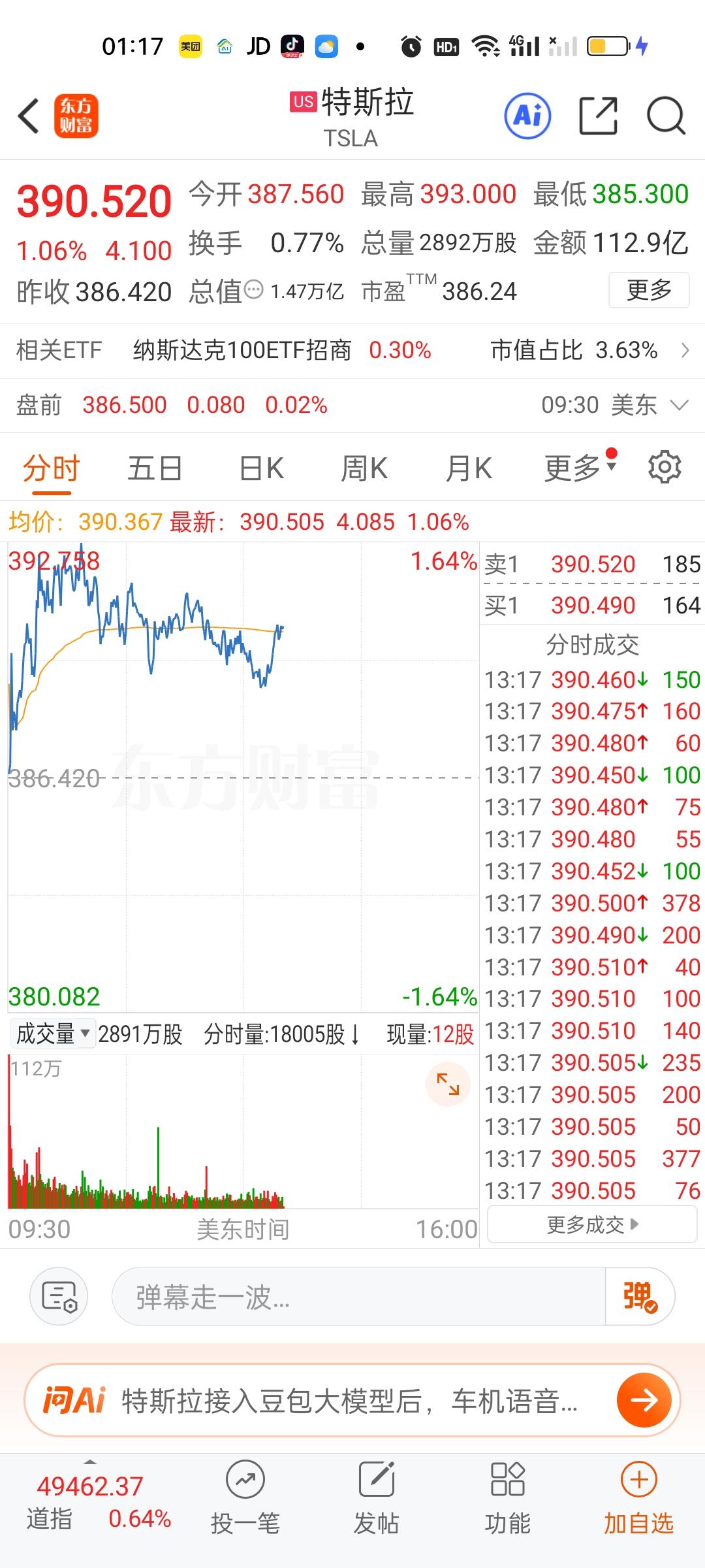 美股今天半导体和存储芯片走的相当不错,但商业航天今天是高开低走的。特斯拉,英伟达,英特尔走的很一般。苹果,微软目前还是上涨的状态。