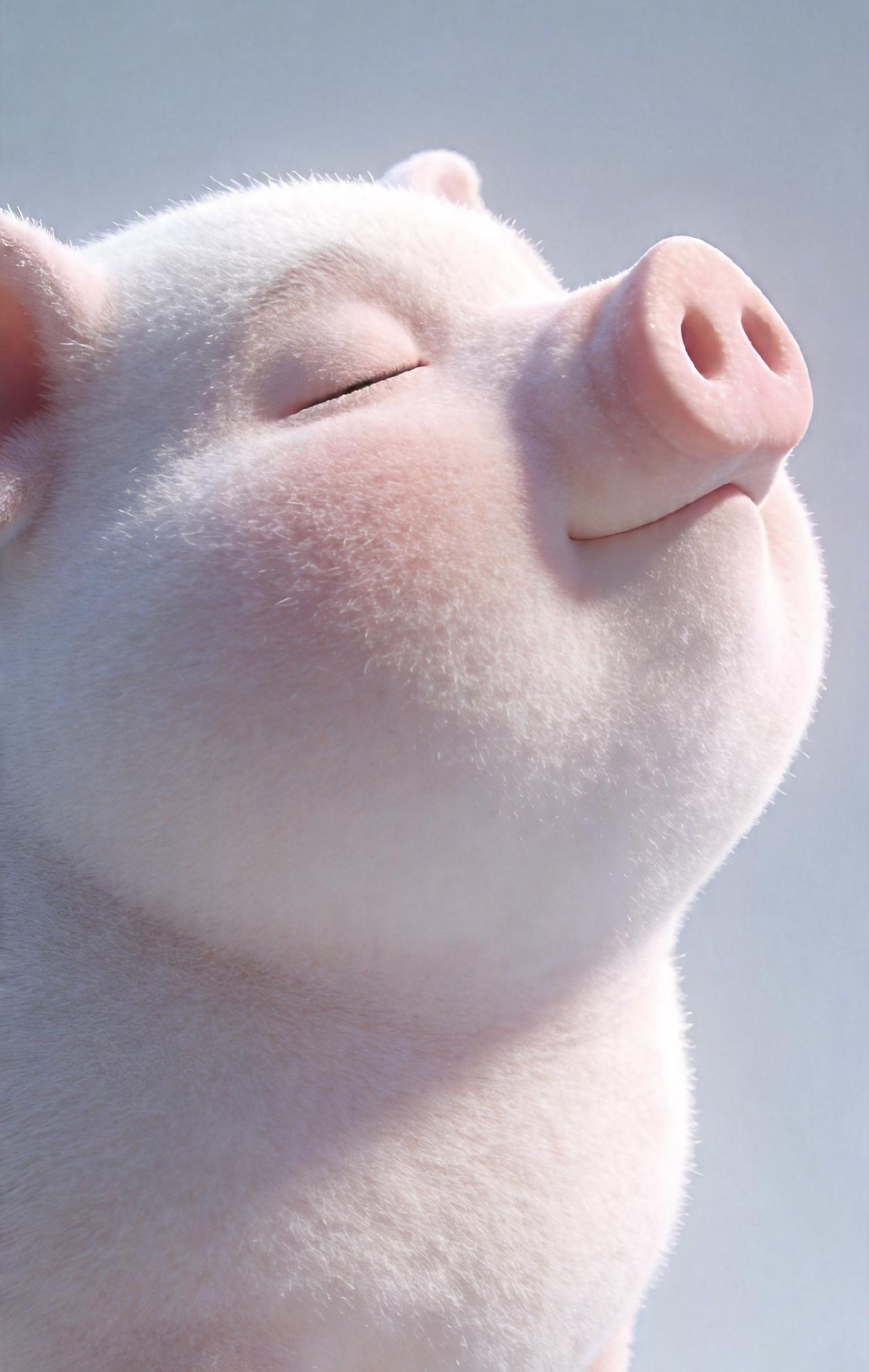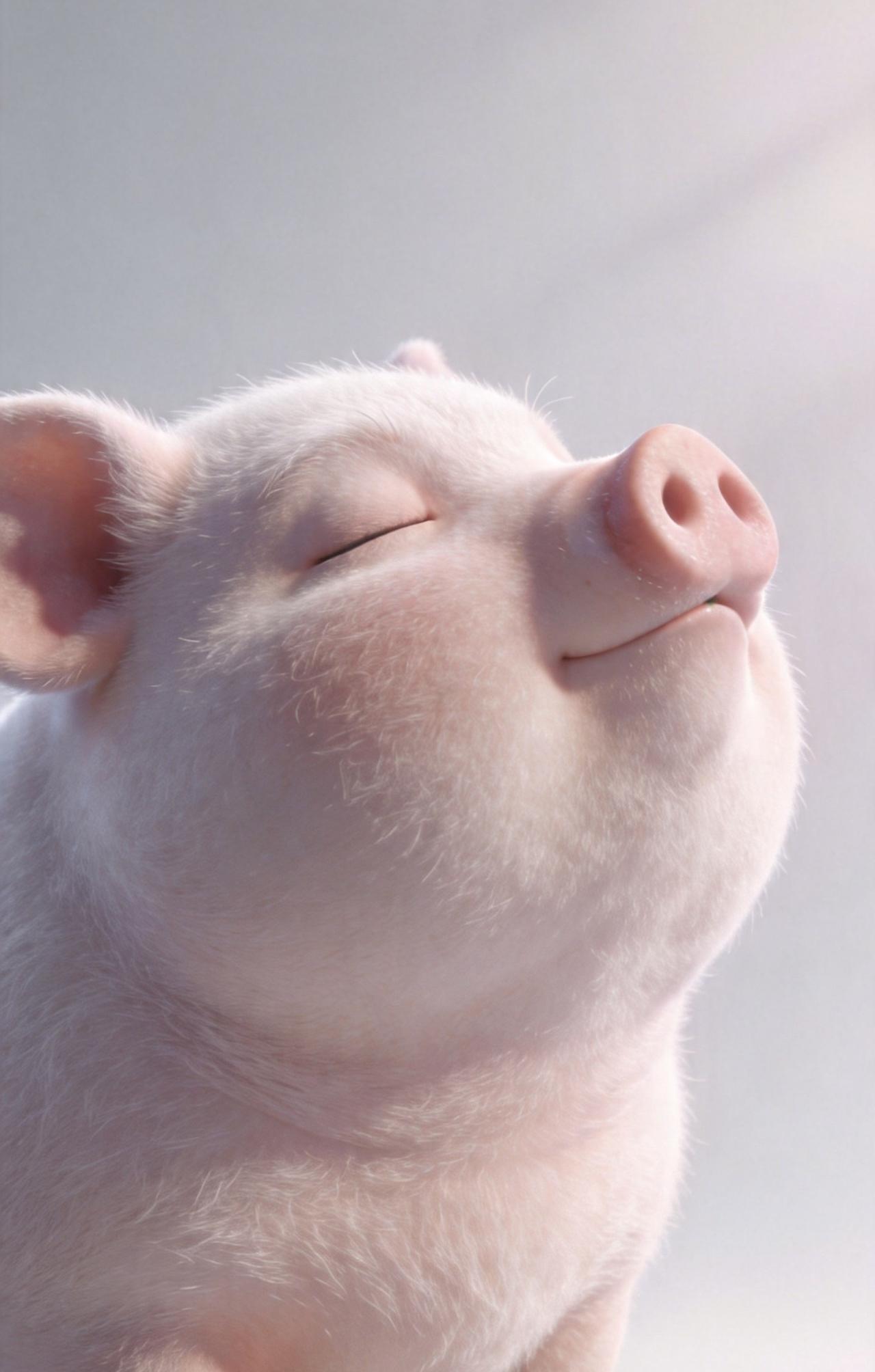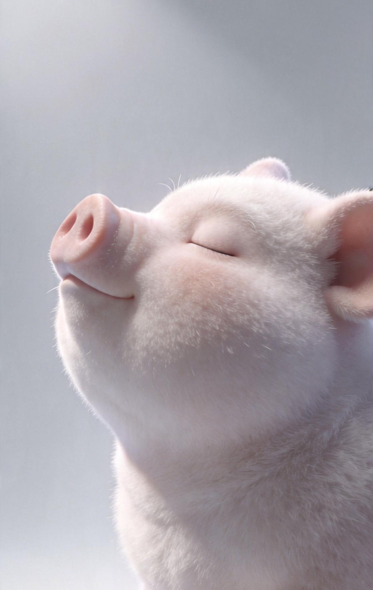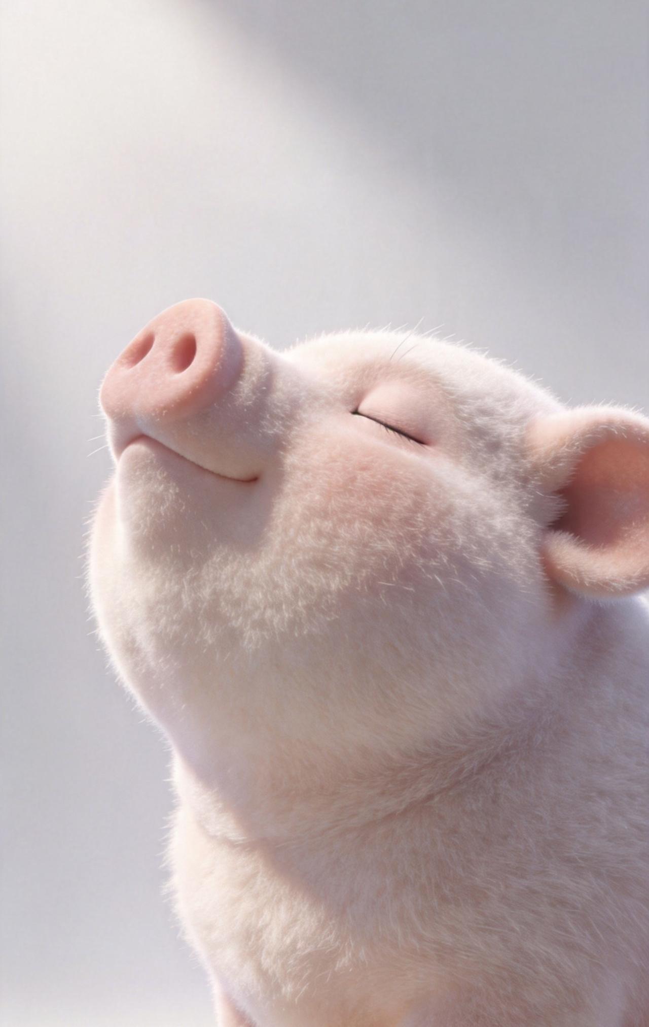 小猪双眼轻闭,头微微上扬,嘴角带着恬淡笑意,粉嫩的脸颊与圆翘的鼻型尽显治愈,浅灰渐变背景衬得主体更柔和。整体光线温暖柔和,营造出惬意安宁的氛围,软萌治愈的气质适配各类手机屏幕,既能点亮屏幕,又能带来轻松愉悦的视觉感受。