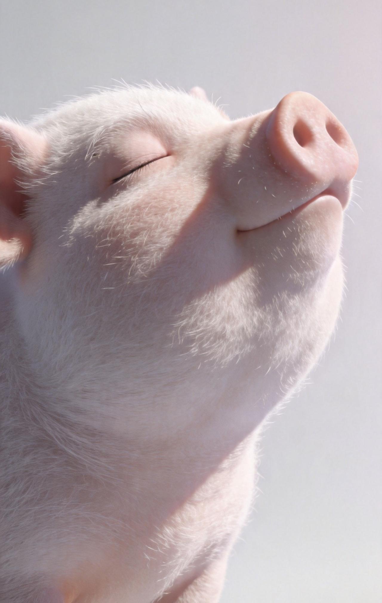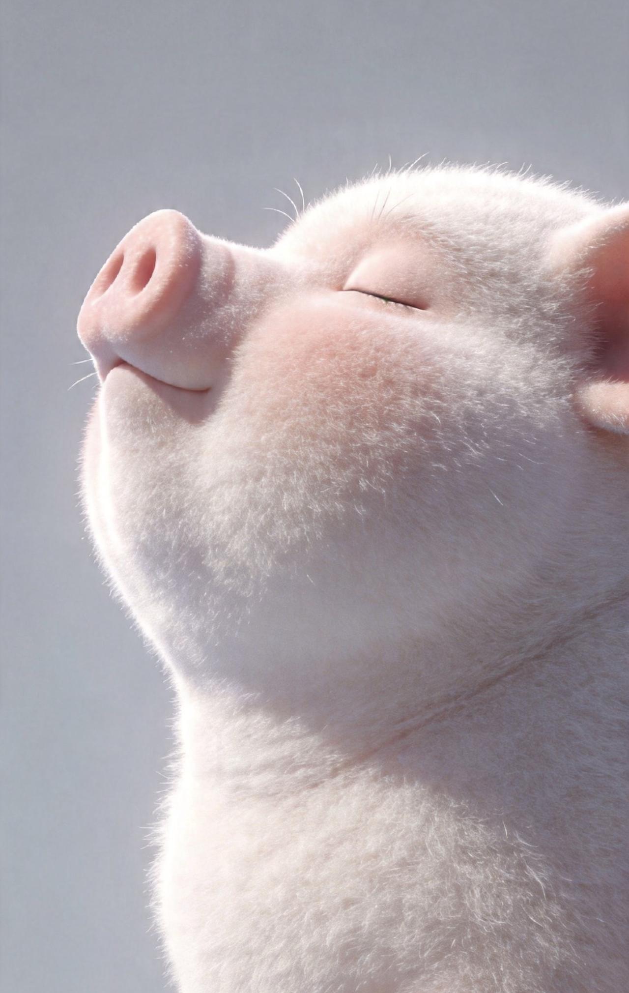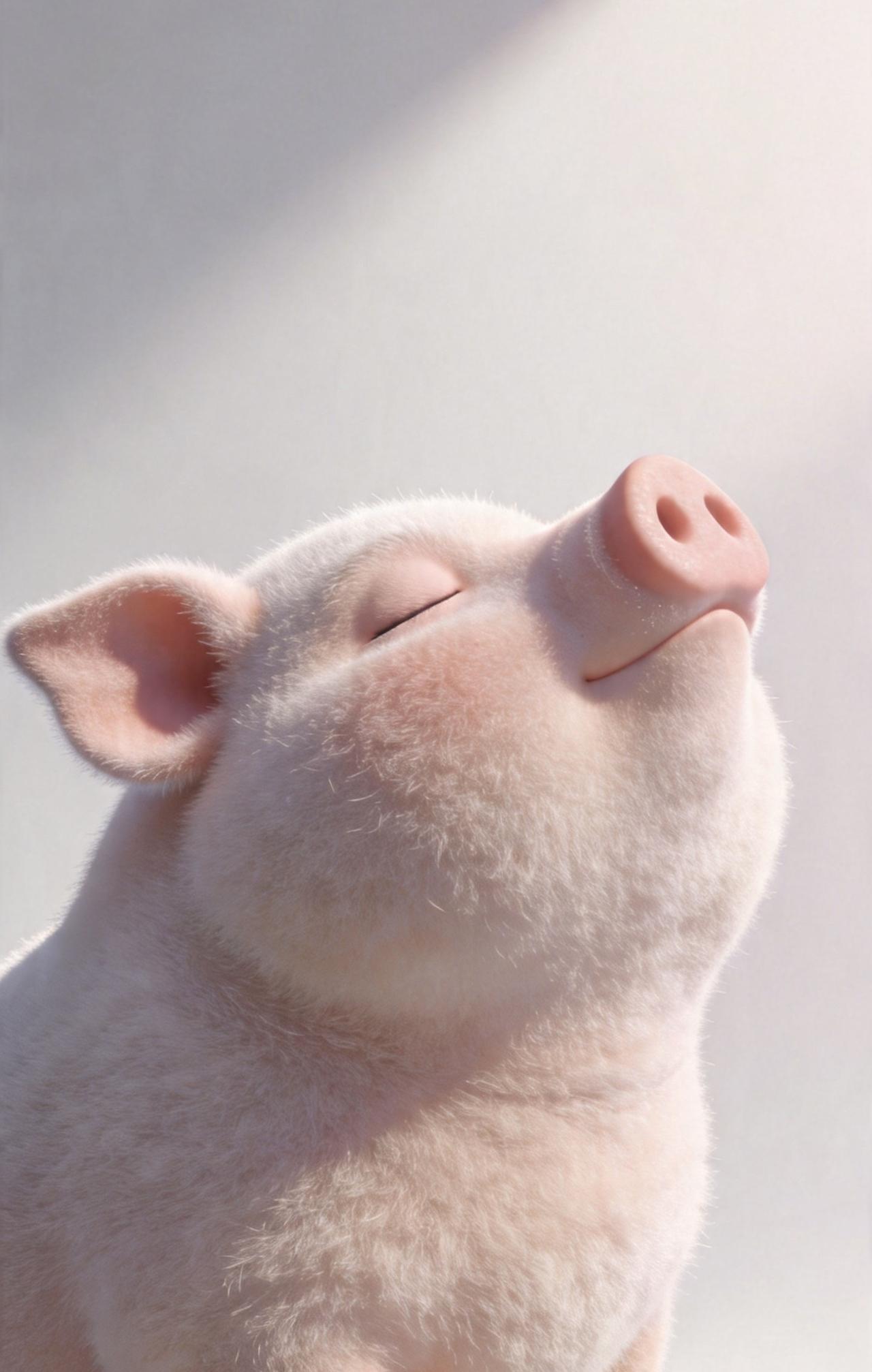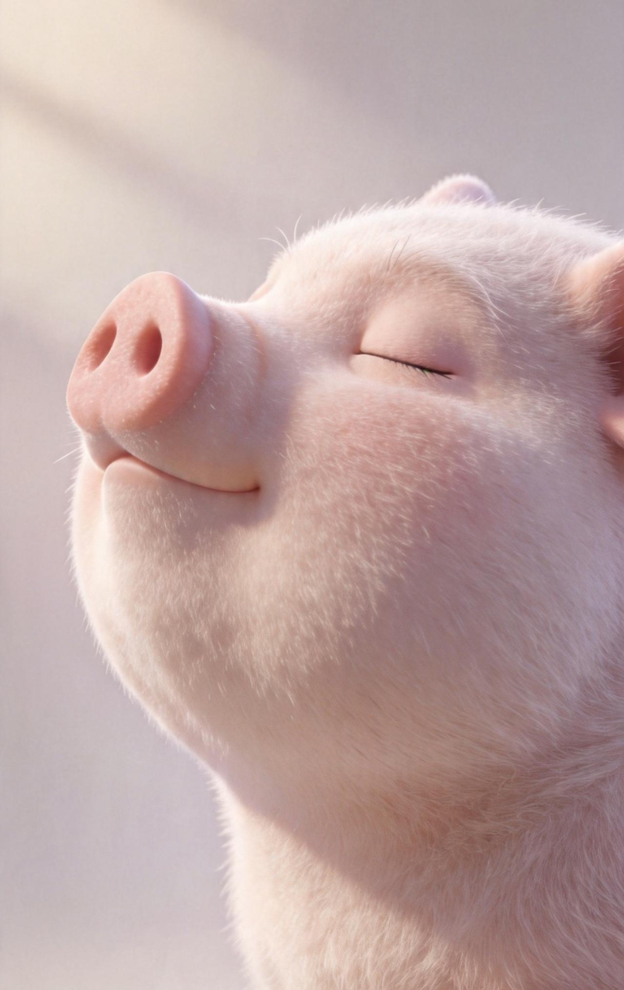 小猪双眼轻闭,头微微上扬,嘴角带着恬淡笑意,粉嫩的脸颊与圆翘的鼻型尽显治愈,浅灰渐变背景衬得主体更柔和。整体光线温暖柔和,营造出惬意安宁的氛围,软萌治愈的气质适配各类手机屏幕,既能点亮屏幕,又能带来轻松愉悦的视觉感受。