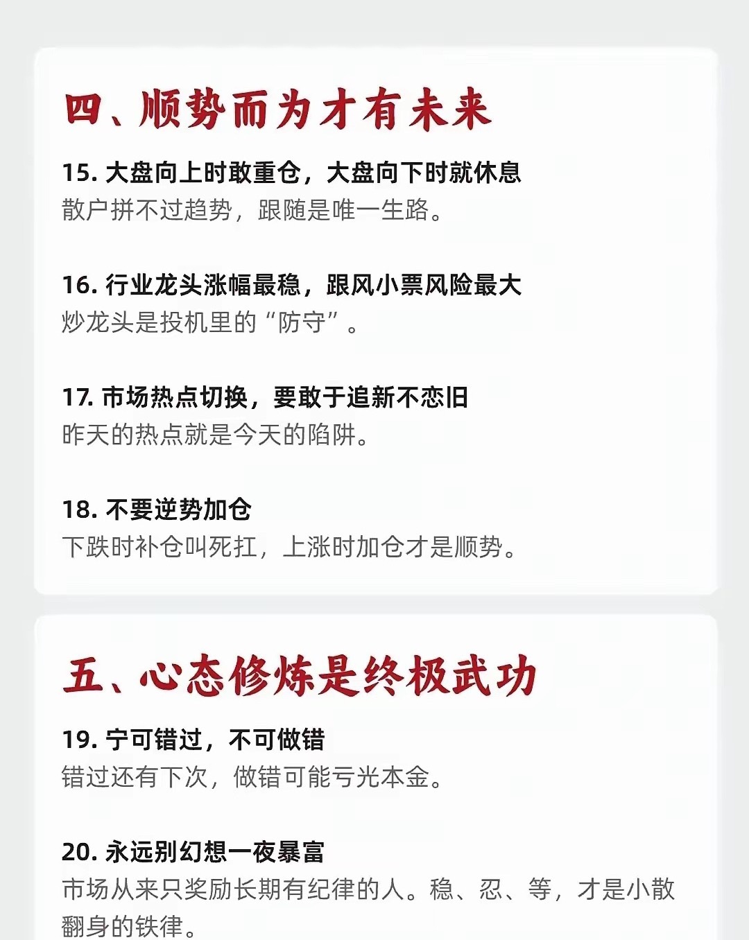 投资这事儿,心态真的太重要了。很多人一看到市场波动就慌了神,追涨杀跌,最后赔得底儿掉。其实,修炼投资心态,关键在于保持理性和耐心。就拿我自己来说,之前买了只股票,刚买没多久就跌了,我没急着抛,而是分析公司基本面。发现公司业绩不错,行业前景也好,就坚定持有。后来股价反弹,赚了不少。别被短期的涨跌影响,要有长远眼光。也别盲目跟风,得有自己的判断。把心态稳住,不贪婪不恐惧,才能在投资这场马拉松里稳赢未来!