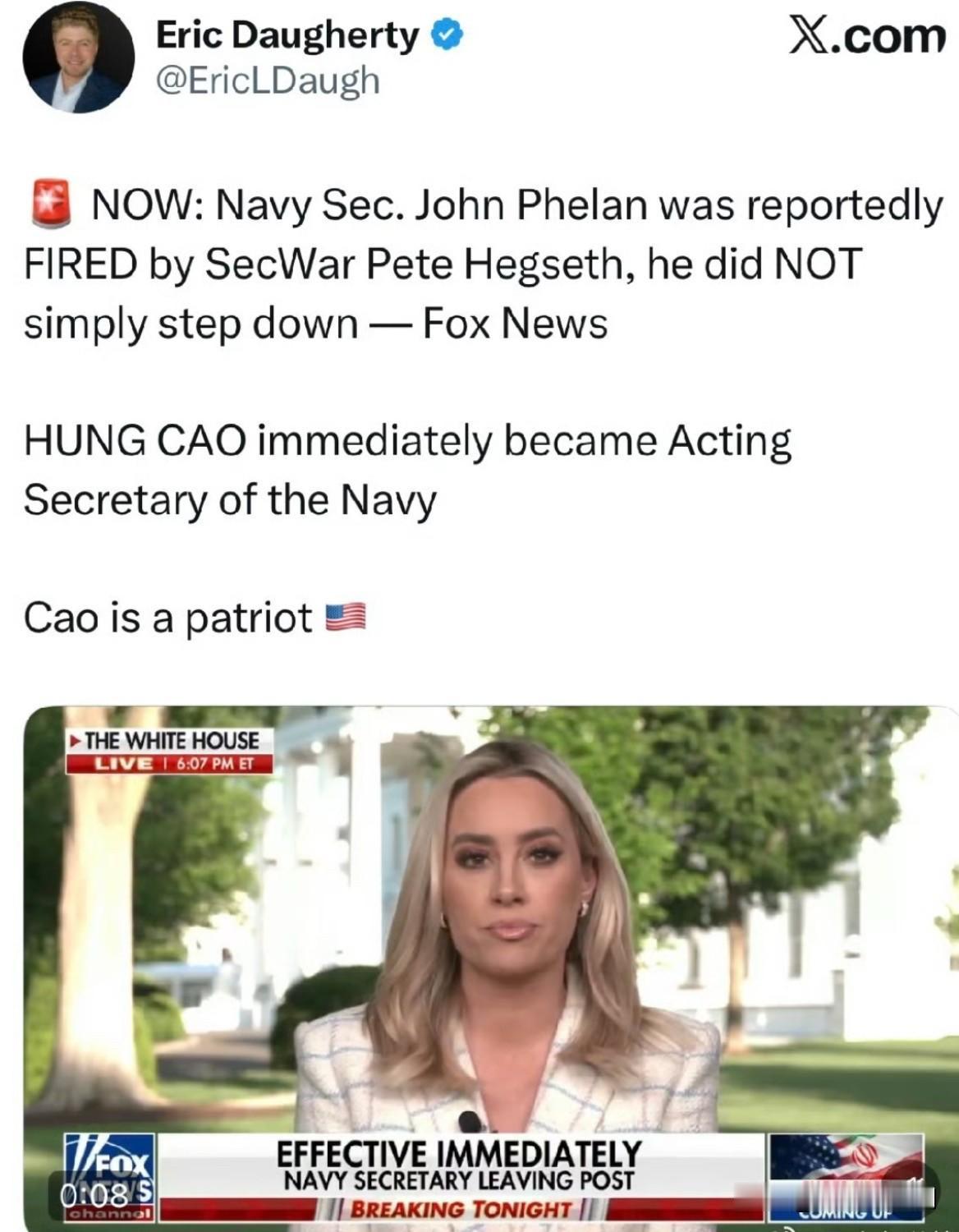 美国国防部宣布美国海军部长约翰·费兰辞职,目前将由越南裔副部长曹洪将担任代理部长。美国国防部没有说明辞职原因,