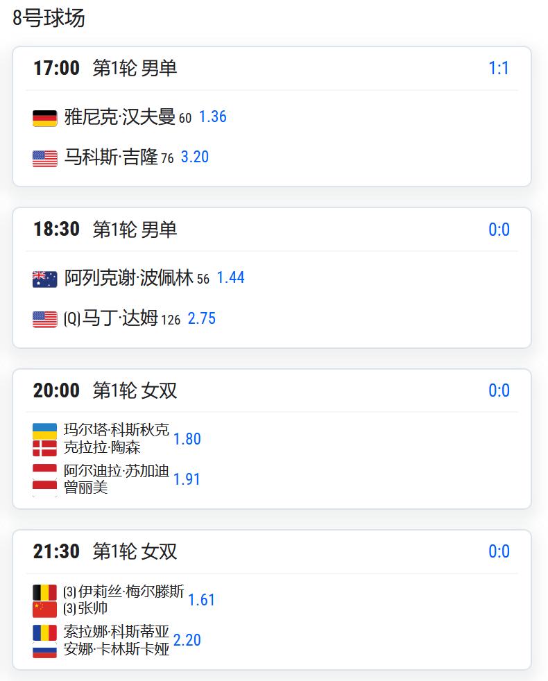 女双第一轮,张帅/梅尔滕斯将对阵科斯蒂亚/卡林斯卡娅;