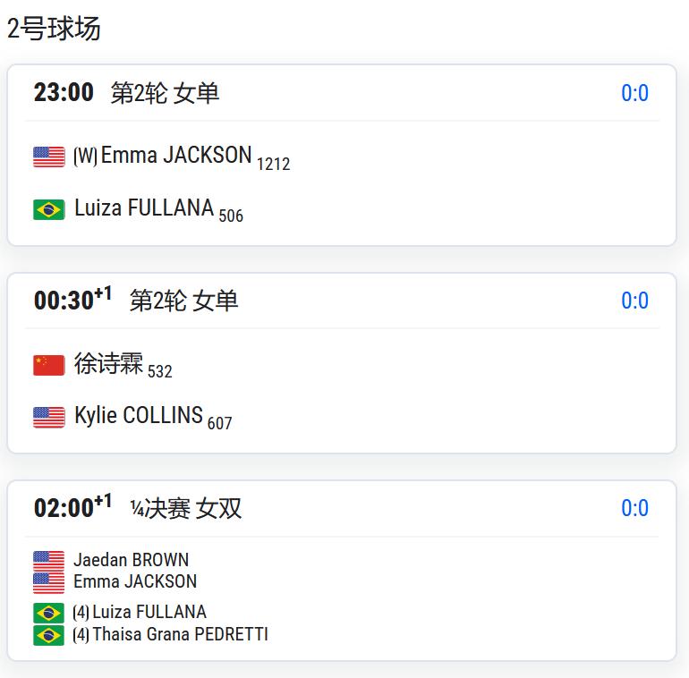 W35夏洛特,女单第二轮,徐诗霖将对阵本土球员科林斯。