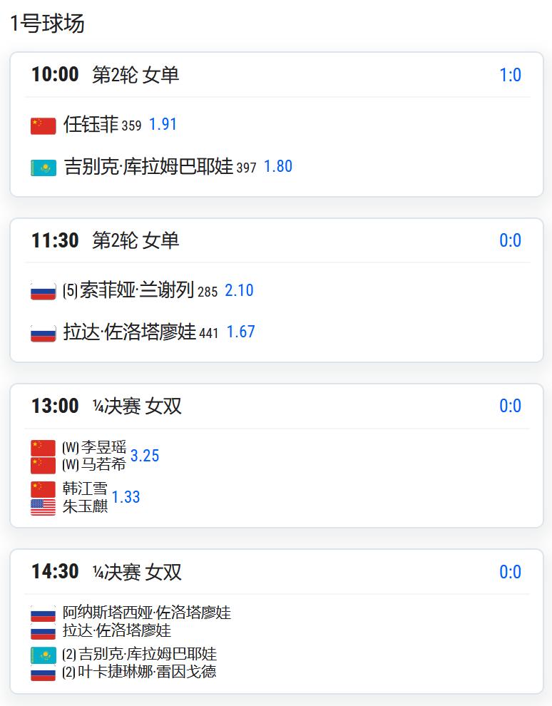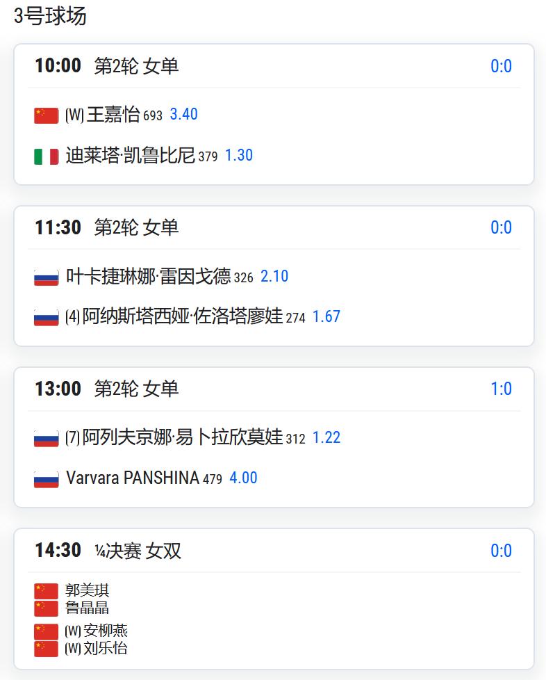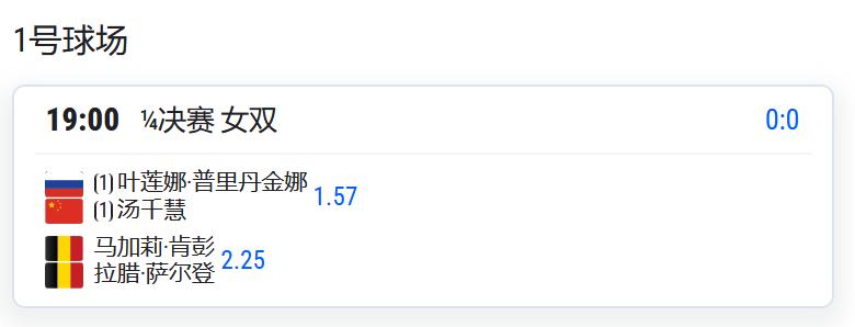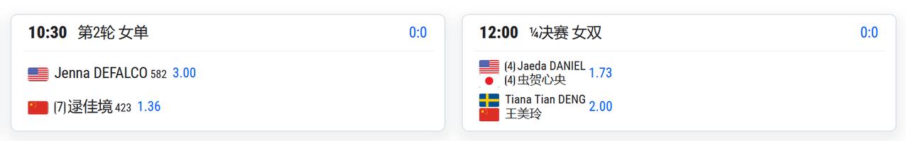 女双四分之一决赛,王美玲搭档瑞典的Tiana对阵4号种子丹尼尔/虫贺心央;