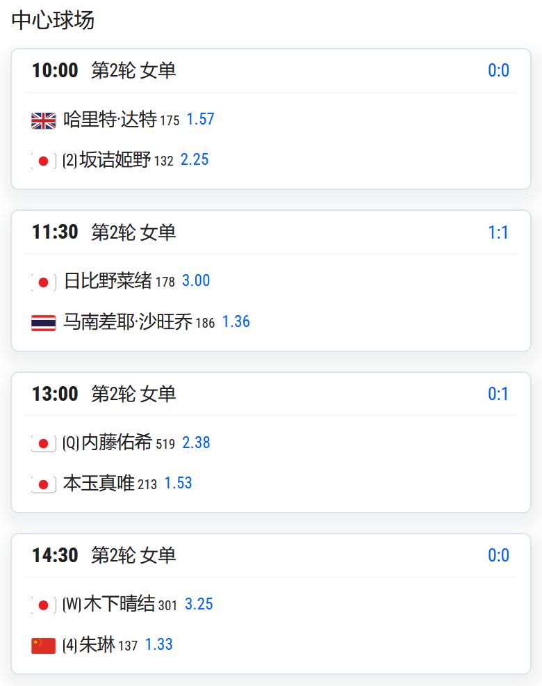 W100东京,女单第二轮,朱琳将对阵本土外卡木下晴结;