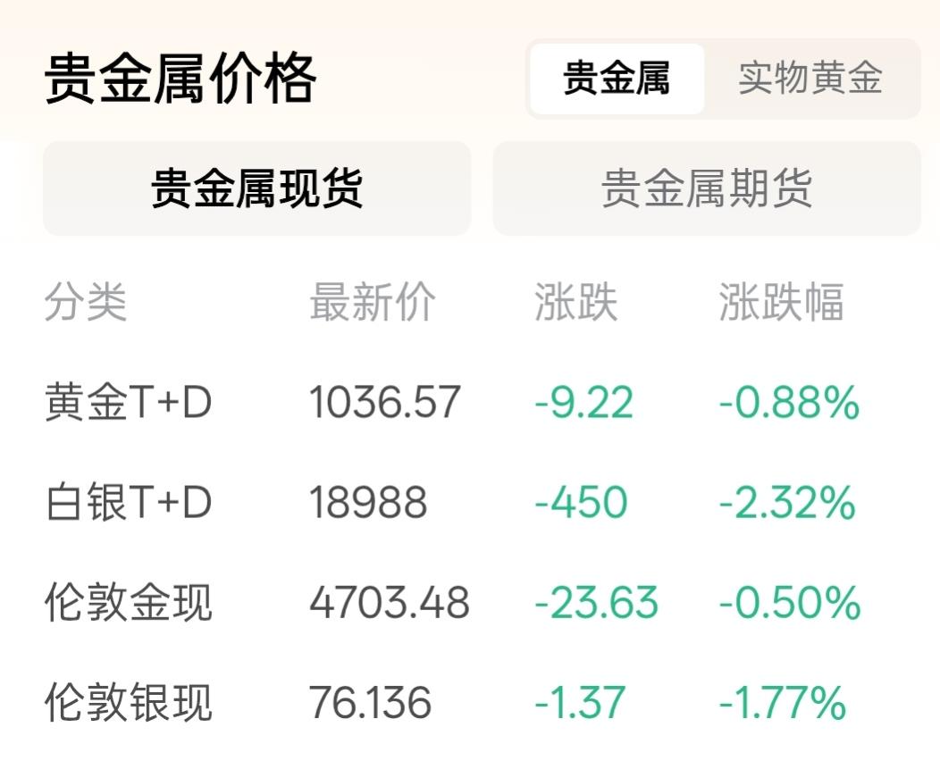 今天是2026年的4月23日,星期四,现在是上午10点30分,这真是一个利好的消息,对我们普通人来说,今天黄金开盘再次下跌,当前的国际金价是1036元每克,最高开1048元每克,最低开1037元每克,开盘是1047元每克,昨结是1045元每克。截止现在黄金价格还在持续的下跌之中。对于我们普通人来说是非常好的一个消息,因为我们普通人的金银首饰越来越近了!有闲钱就去买。