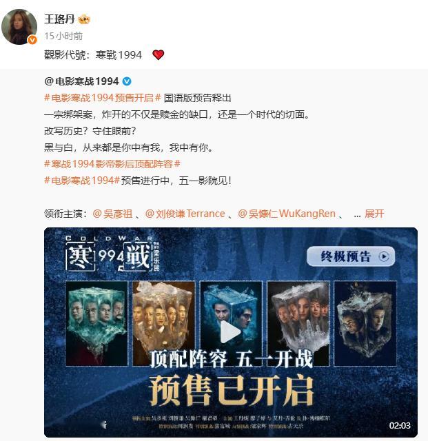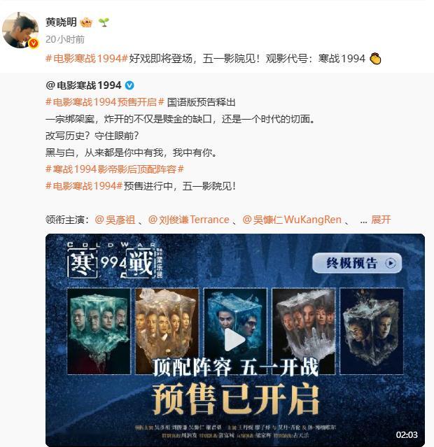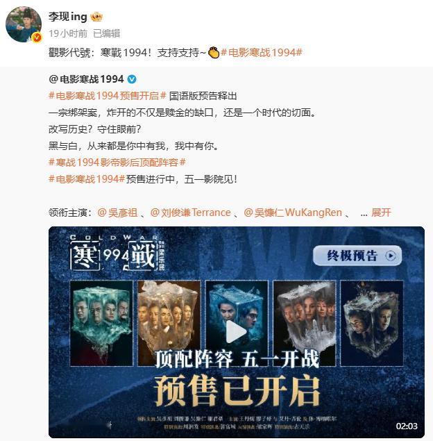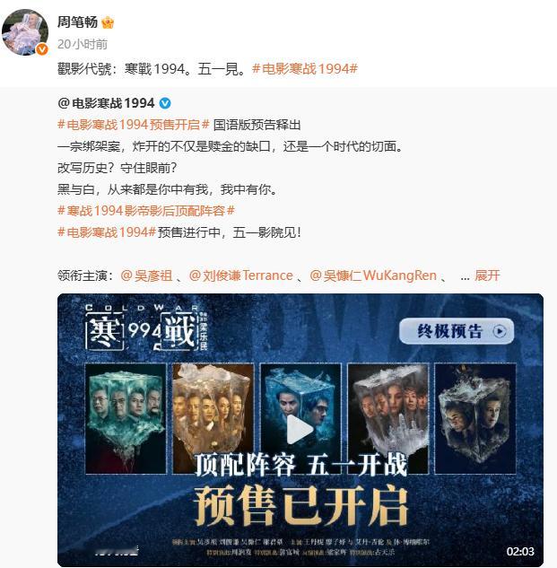 一部寒战搅动半个内娱观影代号寒战1994《寒战1994》摇来了半个娱乐圈!黄晓明、王珞丹、李现、李一桐、井柏然、白宇、周笔畅、欧豪等艺人纷纷转发支持!观影代号:寒战1994!好戏即将登场,五一影院见!