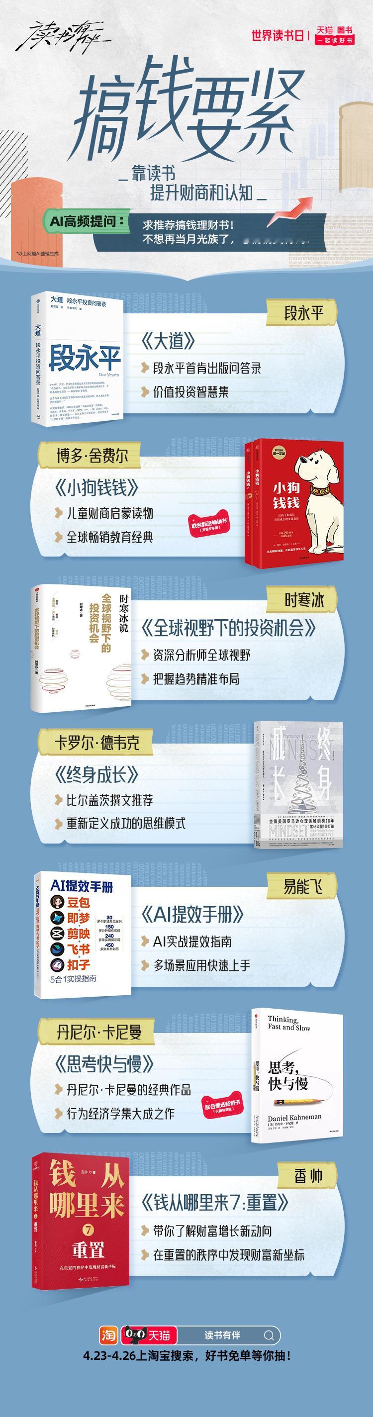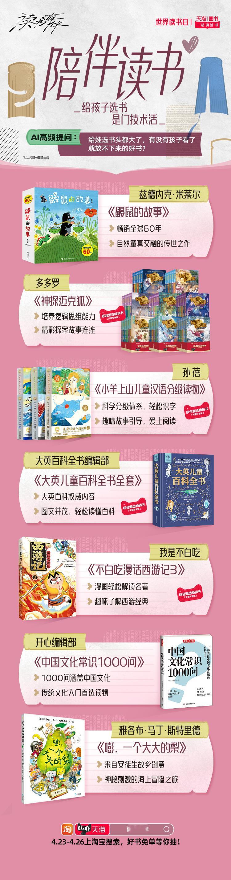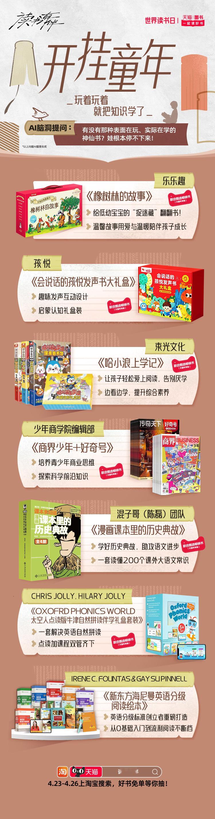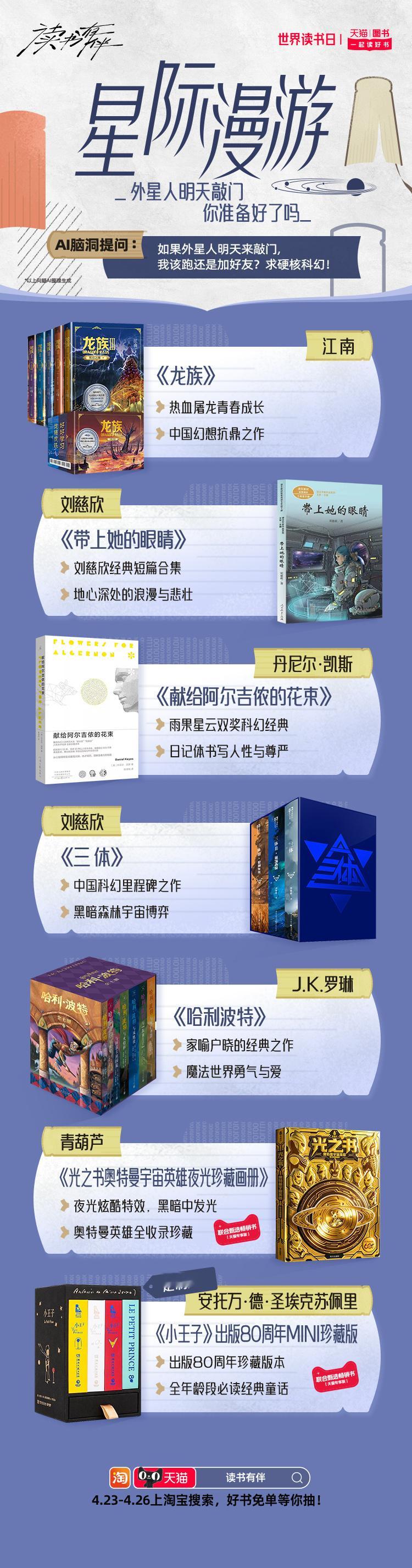 天猫世界读书日 在忙碌的工作与社交间隙,不妨用一本书给自己充充电。天猫图书特别推出AI精选搞钱要紧、开挂童年、情绪自救、星际漫游、循环玩家、知识外挂等10大书单。读书有伴 这个春天和同频伙伴一起读好书,4月23日-4月26日,上淘宝搜【读书有伴】,解锁你的AI专属书单,抽好书免单。天猫图书