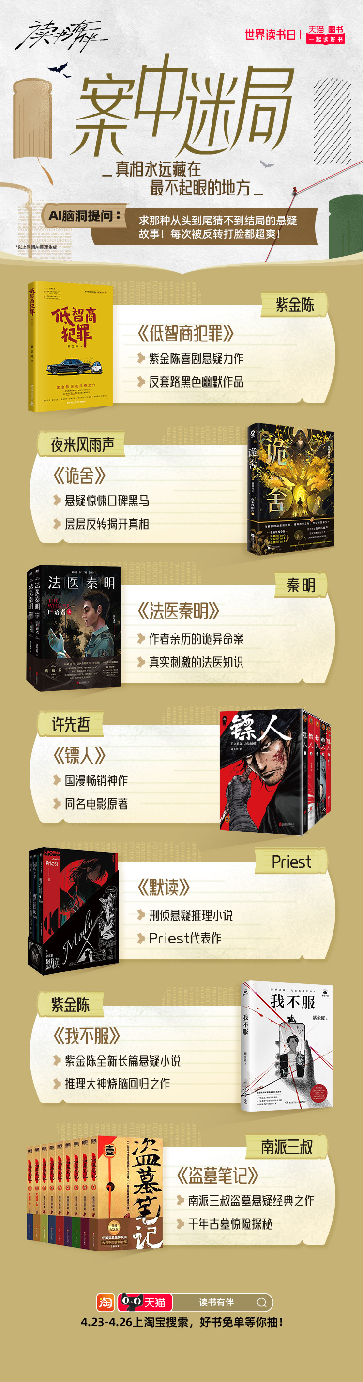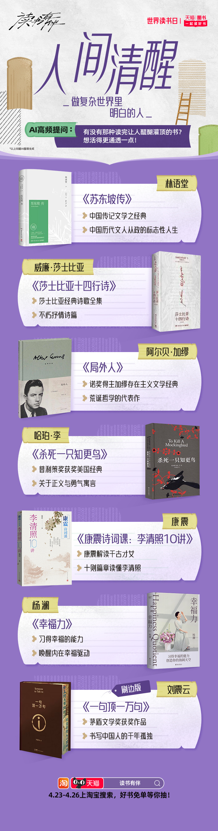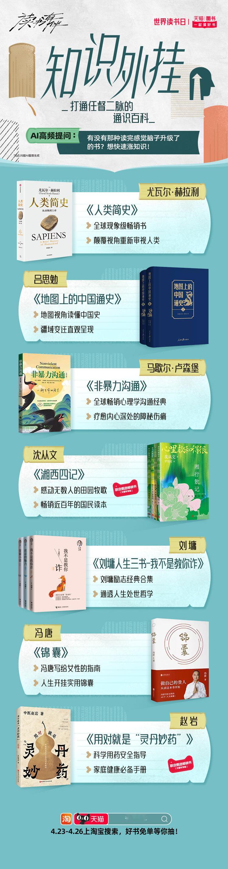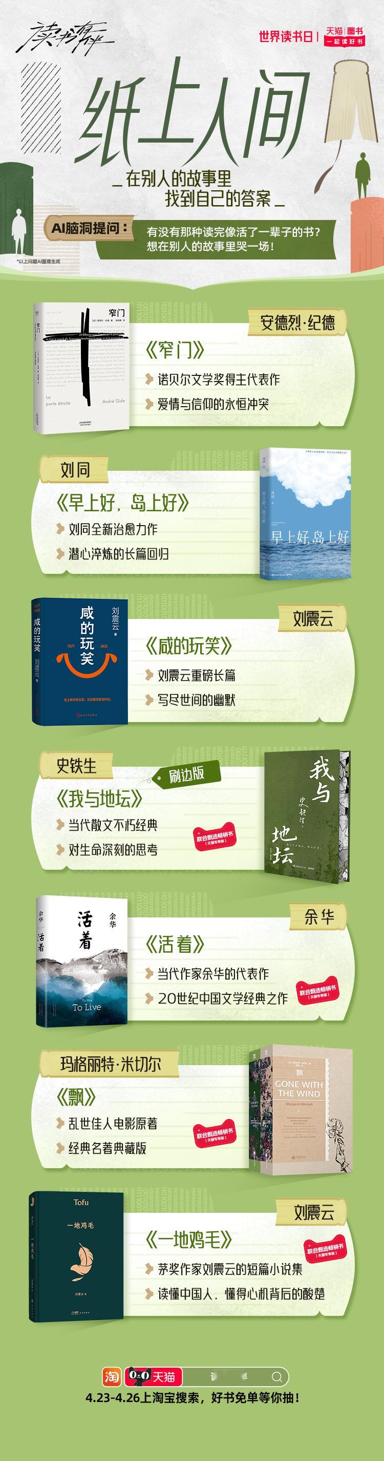 天猫世界读书日 在忙碌的工作与社交间隙,不妨用一本书给自己充充电。天猫图书特别推出AI精选搞钱要紧、开挂童年、情绪自救、星际漫游、循环玩家、知识外挂等10大书单。读书有伴 这个春天和同频伙伴一起读好书,4月23日-4月26日,上淘宝搜【读书有伴】,解锁你的AI专属书单,抽好书免单。天猫图书