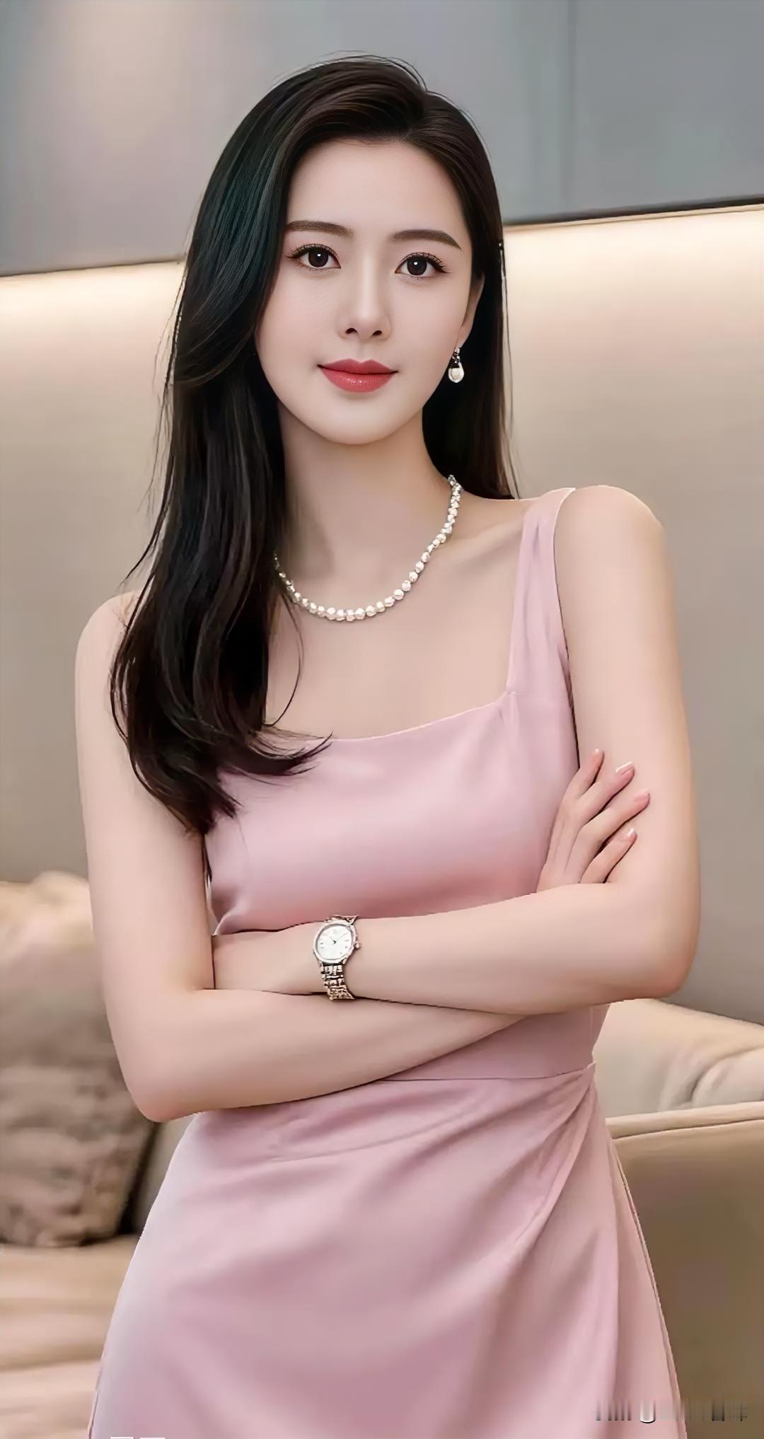 粉裙垂坠,珍珠映腕,静雅自成风景。