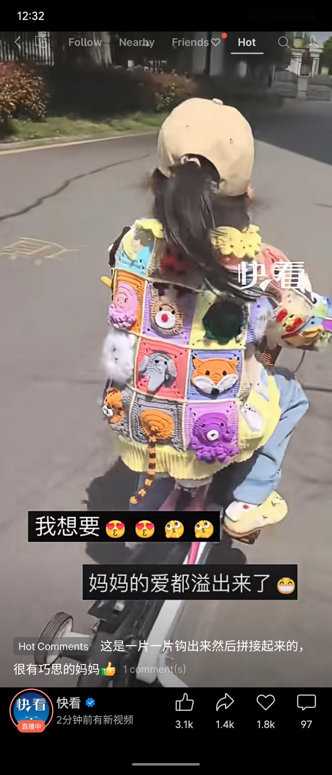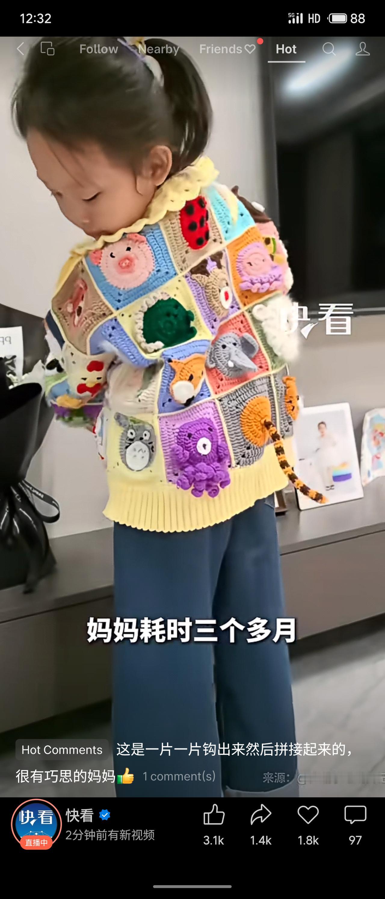 一位妈妈耗时三个多月,亲手为女儿钩织出一件动物造型毛衣。网友感叹“这需要很多很多的爱”“妈妈的爱都溢出来了”。评价:一针一线凝聚着耐心与深情,手工的温度远胜千言万语,既展现了母爱的细腻,也传递出亲子间最温柔的陪伴。